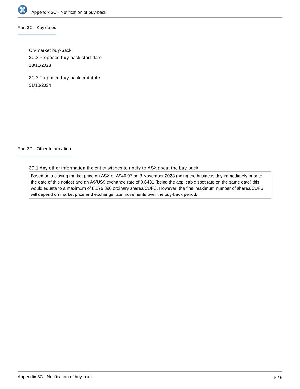 Appendix 3C - Notification of buy-back Appendix 3C - Notification of buy-back 5 / 6 Part 3C - Key dates On-market buy-back 3C.2 Proposed buy-back start date 13/11/2023 3C.3 Proposed buy-back end date 31/10/2024 Part 3D - Other Information 3D.1 Any other information the entity wishes to notify to ASX about the buy-back Based on a closing market price on ASX of A$46.97 on 8 November 2023 (being the business day immediately prior to the date of this notice) and an A$/US$ exchange rate of 0.6431 (being the applicable spot rate on the same date) this would equate to a maximum of 8,276,390 ordinary shares/CUFS. However, the final maximum number of shares/CUFS will depend on market price and exchange rate movements over the buy-back period.