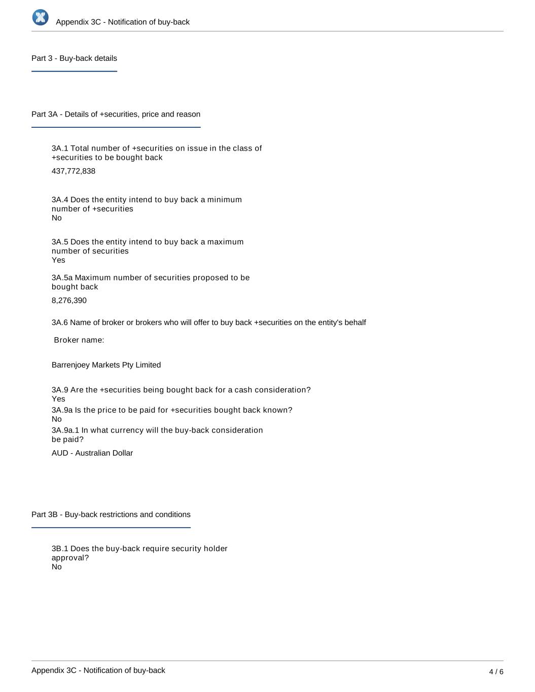 Appendix 3C - Notification of buy-back Appendix 3C - Notification of buy-back 4 / 6 Part 3 - Buy-back details Part 3A - Details of +securities, price and reason 3A.1 Total number of +securities on issue in the class of +securities to be bought back 437,772,838 3A.4 Does the entity intend to buy back a minimum number of +securities 3A.5 Does the entity intend to buy back a maximum number of securities 3A.5a Maximum number of securities proposed to be bought back 8,276,390 3A.6 Name of broker or brokers who will offer to buy back +securities on the entity's behalf Broker name: Barrenjoey Markets Pty Limited 3A.9 Are the +securities being bought back for a cash consideration? 3A.9a Is the price to be paid for +securities bought back known? 3A.9a.1 In what currency will the buy-back consideration be paid? AUD - Australian Dollar Part 3B - Buy-back restrictions and conditions 3B.1 Does the buy-back require security holder approval? No No Yes Yes No