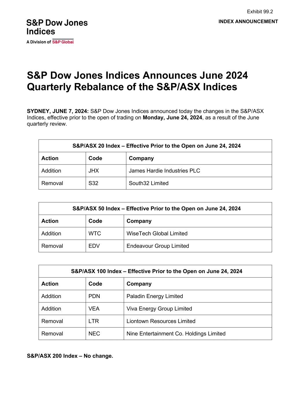 INDEX ANNOUNCEMENT S&P Dow Jones Indices Announces June 2024 Quarterly Rebalance of the S&P/ASX Indices SYDNEY, JUNE 7, 2024: S&P Dow Jones Indices announced today the changes in the S&P/ASX Indices, effective prior to the open of trading on Monday, June 24, 2024, as a result of the June quarterly review. S&P/ASX 20 Index – Effective Prior to the Open on June 24, 2024 Action Code Company Addition JHX James Hardie Industries PLC Removal S32 South32 Limited S&P/ASX 50 Index – Effective Prior to the Open on June 24, 2024 Action Code Company Addition WTC WiseTech Global Limited Removal EDV Endeavour Group Limited S&P/ASX 100 Index – Effective Prior to the Open on June 24, 2024 Action Code Company Addition PDN Paladin Energy Limited Addition VEA Viva Energy Group Limited Removal LTR Liontown Resources Limited Removal NEC Nine Entertainment Co. Holdings Limited S&P/ASX 200 Index – No change. Exhibit 99.2
