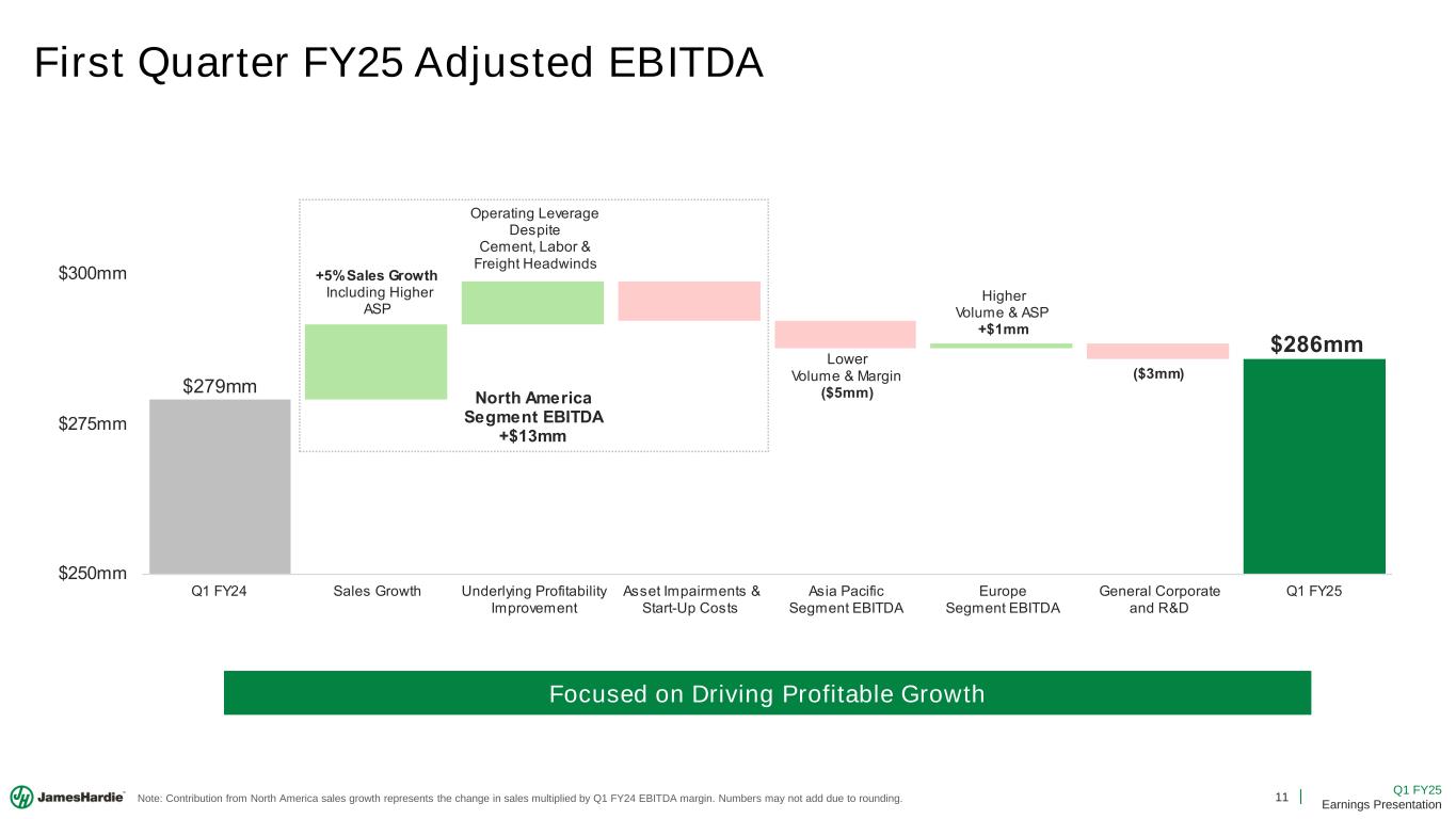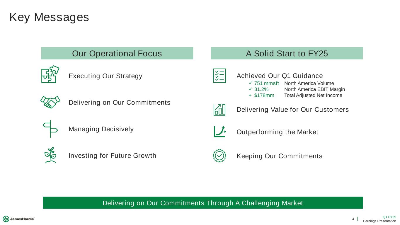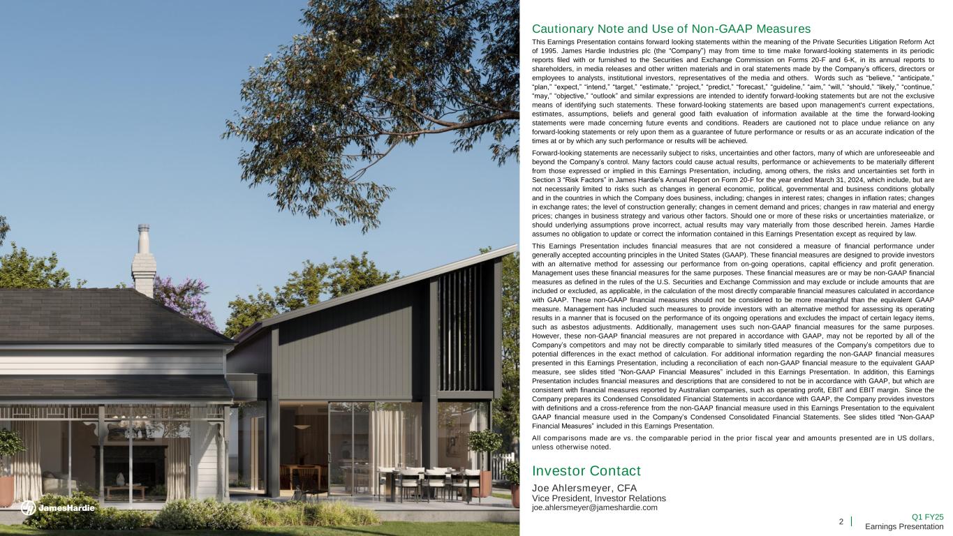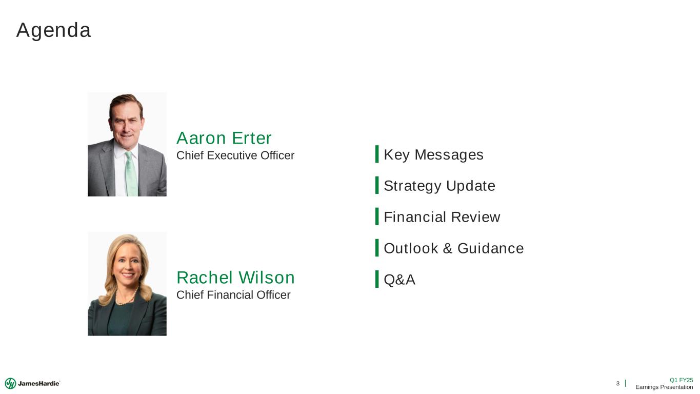 2 Q1 FY25 Earnings Presentation Cautionary Note and Use of Non-GAAP Measures This Earnings Presentation contains forward looking statements within the meaning of the Private Securities Litigation Reform Act of 1995. James Hardie Industries plc (the “Company”) may from time to time make forward-looking statements in its periodic reports filed with or furnished to the Securities and Exchange Commission on Forms 20-F and 6-K, in its annual reports to shareholders, in media releases and other written materials and in oral statements made by the Company’s officers, directors or employees to analysts, institutional investors, representatives of the media and others. Words such as “believe,” “anticipate,” “plan,” “expect,” “intend,” “target,” “estimate,” “project,” “predict,” “forecast,” “guideline,” “aim,” “will,” “should,” “likely,” “continue,” “may,” “objective,” “outlook” and similar expressions are intended to identify forward-looking statements but are not the exclusive means of identifying such statements. These forward-looking statements are based upon management's current expectations, estimates, assumptions, beliefs and general good faith evaluation of information available at the time the forward-looking statements were made concerning future events and conditions. Readers are cautioned not to place undue reliance on any forward-looking statements or rely upon them as a guarantee of future performance or results or as an accurate indication of the times at or by which any such performance or results will be achieved. Forward-looking statements are necessarily subject to risks, uncertainties and other factors, many of which are unforeseeable and beyond the Company’s control. Many factors could cause actual results, performance or achievements to be materially different from those expressed or implied in this Earnings Presentation, including, among others, the risks and uncertainties set forth in Section 3 “Risk Factors” in James Hardie’s Annual Report on Form 20-F for the year ended March 31, 2024, which include, but are not necessarily limited to risks such as changes in general economic, political, governmental and business conditions globally and in the countries in which the Company does business, including; changes in interest rates; changes in inflation rates; changes in exchange rates; the level of construction generally; changes in cement demand and prices; changes in raw material and energy prices; changes in business strategy and various other factors. Should one or more of these risks or uncertainties materialize, or should underlying assumptions prove incorrect, actual results may vary materially from those described herein. James Hardie assumes no obligation to update or correct the information contained in this Earnings Presentation except as required by law. This Earnings Presentation includes financial measures that are not considered a measure of financial performance under generally accepted accounting principles in the United States (GAAP). These financial measures are designed to provide investors with an alternative method for assessing our performance from on-going operations, capital efficiency and profit generation. Management uses these financial measures for the same purposes. These financial measures are or may be non-GAAP financial measures as defined in the rules of the U.S. Securities and Exchange Commission and may exclude or include amounts that are included or excluded, as applicable, in the calculation of the most directly comparable financial measures calculated in accordance with GAAP. These non-GAAP financial measures should not be considered to be more meaningful than the equivalent GAAP measure. Management has included such measures to provide investors with an alternative method for assessing its operating results in a manner that is focused on the performance of its ongoing operations and excludes the impact of certain legacy items, such as asbestos adjustments. Additionally, management uses such non-GAAP financial measures for the same purposes. However, these non-GAAP financial measures are not prepared in accordance with GAAP, may not be reported by all of the Company’s competitors and may not be directly comparable to similarly titled measures of the Company’s competitors due to potential differences in the exact method of calculation. For additional information regarding the non-GAAP financial measures presented in this Earnings Presentation, including a reconciliation of each non-GAAP financial measure to the equivalent GAAP measure, see slides titled “Non-GAAP Financial Measures” included in this Earnings Presentation. In addition, this Earnings Presentation includes financial measures and descriptions that are considered to not be in accordance with GAAP, but which are consistent with financial measures reported by Australian companies, such as operating profit, EBIT and EBIT margin. Since the Company prepares its Condensed Consolidated Financial Statements in accordance with GAAP, the Company provides investors with definitions and a cross-reference from the non-GAAP financial measure used in this Earnings Presentation to the equivalent GAAP financial measure used in the Company’s Condensed Consolidated Financial Statements. See slides titled “Non-GAAP Financial Measures” included in this Earnings Presentation. All comparisons made are vs. the comparable period in the prior fiscal year and amounts presented are in US dollars, unless otherwise noted. Investor Contact Joe Ahlersmeyer, CFA Vice President, Investor Relations [email protected]