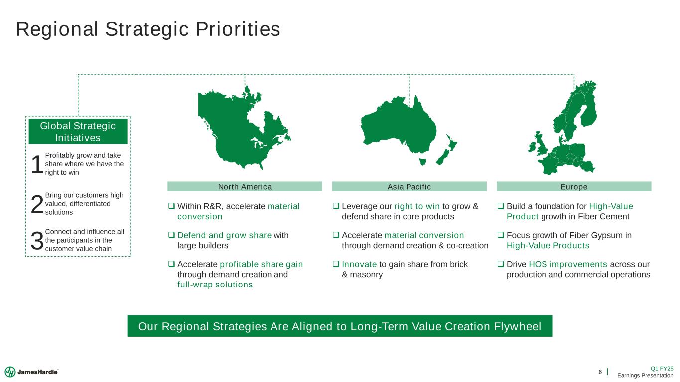 5 Q1 FY25 Earnings Presentation 1 2 3 Profitably grow and take share where we have the right to win Bring our customers high valued, differentiated solutions Connect and influence all the participants in the customer value chain Our Strategy Spans the Value Chain Homeowner Focused, Customer and Contractor Driven Innovative Solutions Brand of Choice Strategic Initiatives Supported By Our Foundational Imperatives Enabled By Customer Integration Capacity Expansion