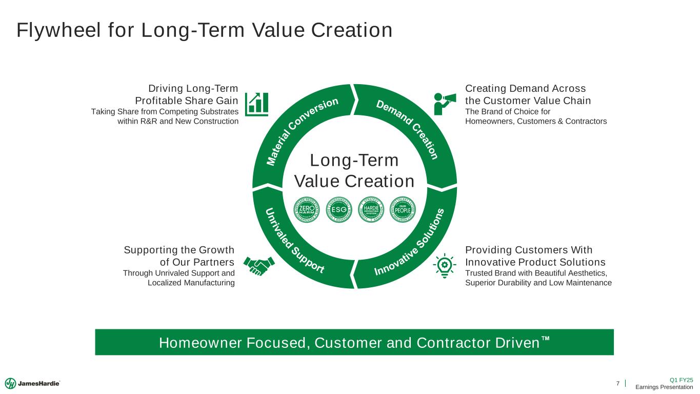 6 Q1 FY25 Earnings Presentation Regional Strategic Priorities Our Regional Strategies Are Aligned to Long-Term Value Creation Flywheel Asia Pacific Europe 1 2 3 Profitably grow and take share where we have the right to win Bring our customers high valued, differentiated solutions Connect and influence all the participants in the customer value chain Global Strategic Initiatives North America ❑ Within R&R, accelerate material conversion ❑ Defend and grow share with large builders ❑ Accelerate profitable share gain through demand creation and full-wrap solutions ❑ Leverage our right to win to grow & defend share in core products ❑ Accelerate material conversion through demand creation & co-creation ❑ Innovate to gain share from brick & masonry ❑ Build a foundation for High-Value Product growth in Fiber Cement ❑ Focus growth of Fiber Gypsum in High-Value Products ❑ Drive HOS improvements across our production and commercial operations