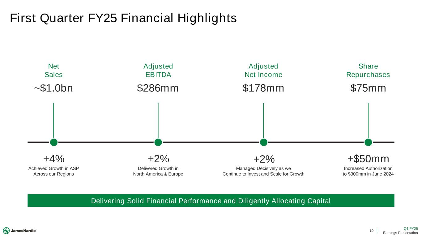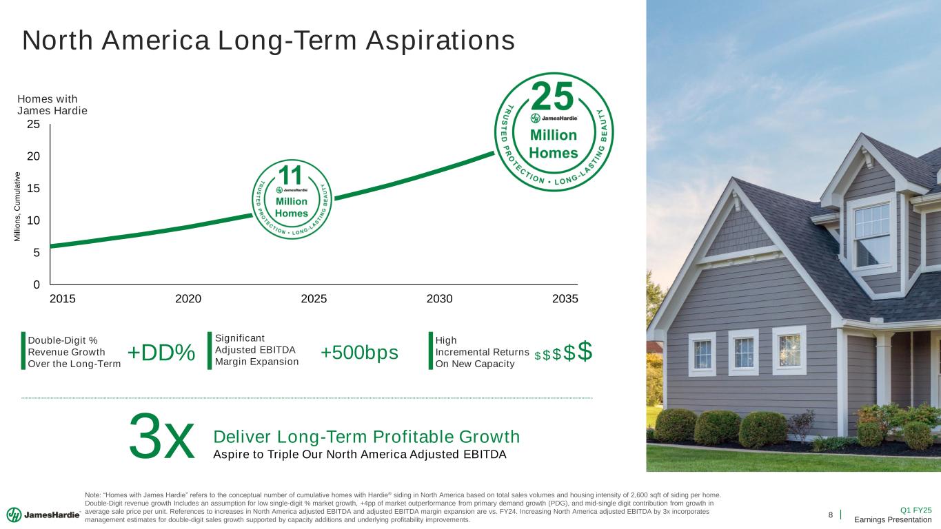 8 Q1 FY25 Earnings Presentation North America Long-Term Aspirations Note: “Homes with James Hardie” refers to the conceptual number of cumulative homes with Hardie® siding in North America based on total sales volumes and housing intensity of 2,600 sqft of siding per home. Double-Digit revenue growth Includes an assumption for low single-digit % market growth, +4pp of market outperformance from primary demand growth (PDG), and mid-single digit contribution from growth in average sale price per unit. References to increases in North America adjusted EBITDA and adjusted EBITDA margin expansion are vs. FY24. Increasing North America adjusted EBITDA by 3x incorporates management estimates for double-digit sales growth supported by capacity additions and underlying profitability improvements. Homes with James Hardie 0 5 10 15 20 25 2015 2020 2025 2030 2035 M ill io n s , C u m u la ti v e Deliver Long-Term Profitable Growth Aspire to Triple Our North America Adjusted EBITDA3x Double-Digit % Revenue Growth Over the Long-Term +DD% Significant Adjusted EBITDA Margin Expansion +500bps $ $ $ $$ High Incremental Returns On New Capacity