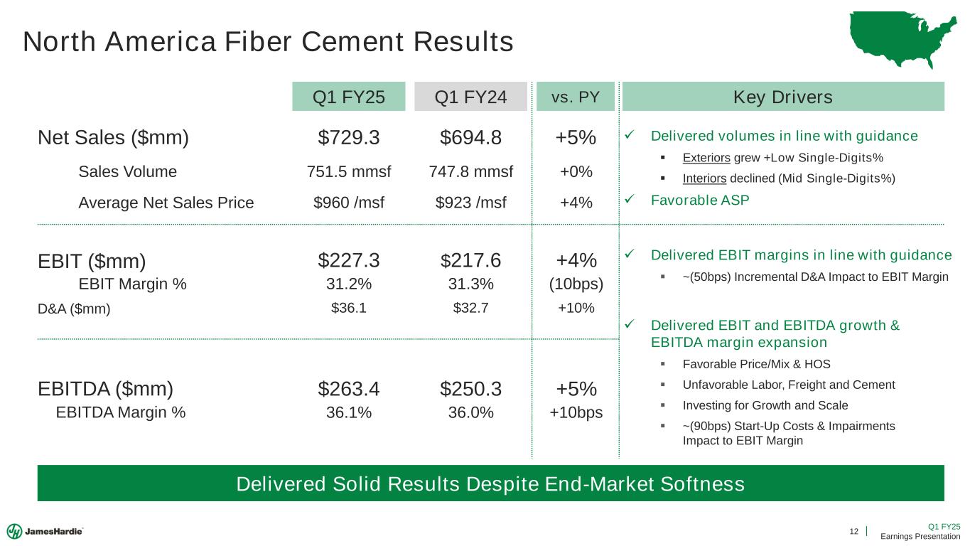 11 Q1 FY25 Earnings Presentation First Quarter FY25 Adjusted EBITDA Note: Contribution from North America sales growth represents the change in sales multiplied by Q1 FY24 EBITDA margin. Numbers may not add due to rounding. Focused on Driving Profitable Growth mm ncluding Higher perating everage espite Cement, abor Freight Headwinds ower olume Margin Higher olume mm mm mm F ales rowth nderlying rofitability mprovement sset mpairments tart p Costs sia acific egment urope egment eneral Corporate and R F