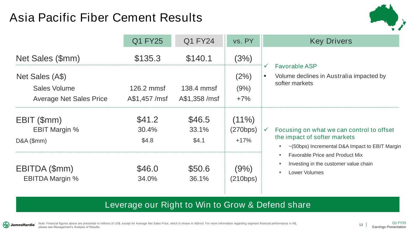 12 Q1 FY25 Earnings Presentation North America Fiber Cement Results Net Sales ($mm) EBIT ($mm) EBITDA ($mm) EBITDA Margin % EBIT Margin % Average Net Sales Price Sales Volume Q1 FY25 Q1 FY24 vs. PY $729.3 $694.8 +5% Delivered Solid Results Despite End-Market Softness 751.5 mmsf 747.8 mmsf +0% $960 /msf $923 /msf +4% $227.3 $217.6 +4% 31.2% 31.3% (10bps) Key Drivers ✓ Delivered volumes in line with guidance ▪ Exteriors grew +Low Single-Digits% ▪ Interiors declined (Mid Single-Digits%) ✓ Favorable ASP ✓ Delivered EBIT margins in line with guidance ▪ ~(50bps) Incremental D&A Impact to EBIT Margin $263.4 $250.3 +5% 36.1% 36.0% +10bps D&A ($mm) $36.1 $32.7 +10% ✓ Delivered EBIT and EBITDA growth & EBITDA margin expansion ▪ Favorable Price/Mix & HOS ▪ Unfavorable Labor, Freight and Cement ▪ Investing for Growth and Scale ▪ ~(90bps) Start-Up Costs & Impairments Impact to EBIT Margin