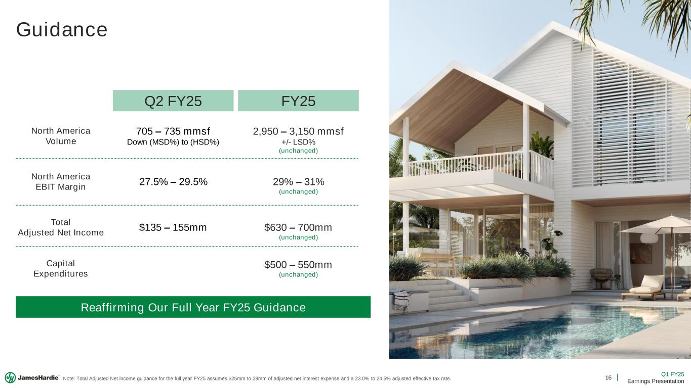 15 Q1 FY25 Earnings Presentation FY25 North America Volume Outlook Down (LSD%) To (MSD%) Reaffirming Our Full Year Volume Guidance and Commitment to Outperform in Any Market (High-Teens %) Decline +LSD% to +MSD% Growth (MSD%) to (HSD%) Decline Note: utlook and guidance represent management’s market and North merica volume expectations for growth or decline in F vs. FY24. +/- LSD% vs. FY24 Markets Remain Uncertain FY25 North America Volumes Market Outperformance +4% (Primary Demand Growth) Residential R&R Single-Family New Construction Multi-Family New Construction