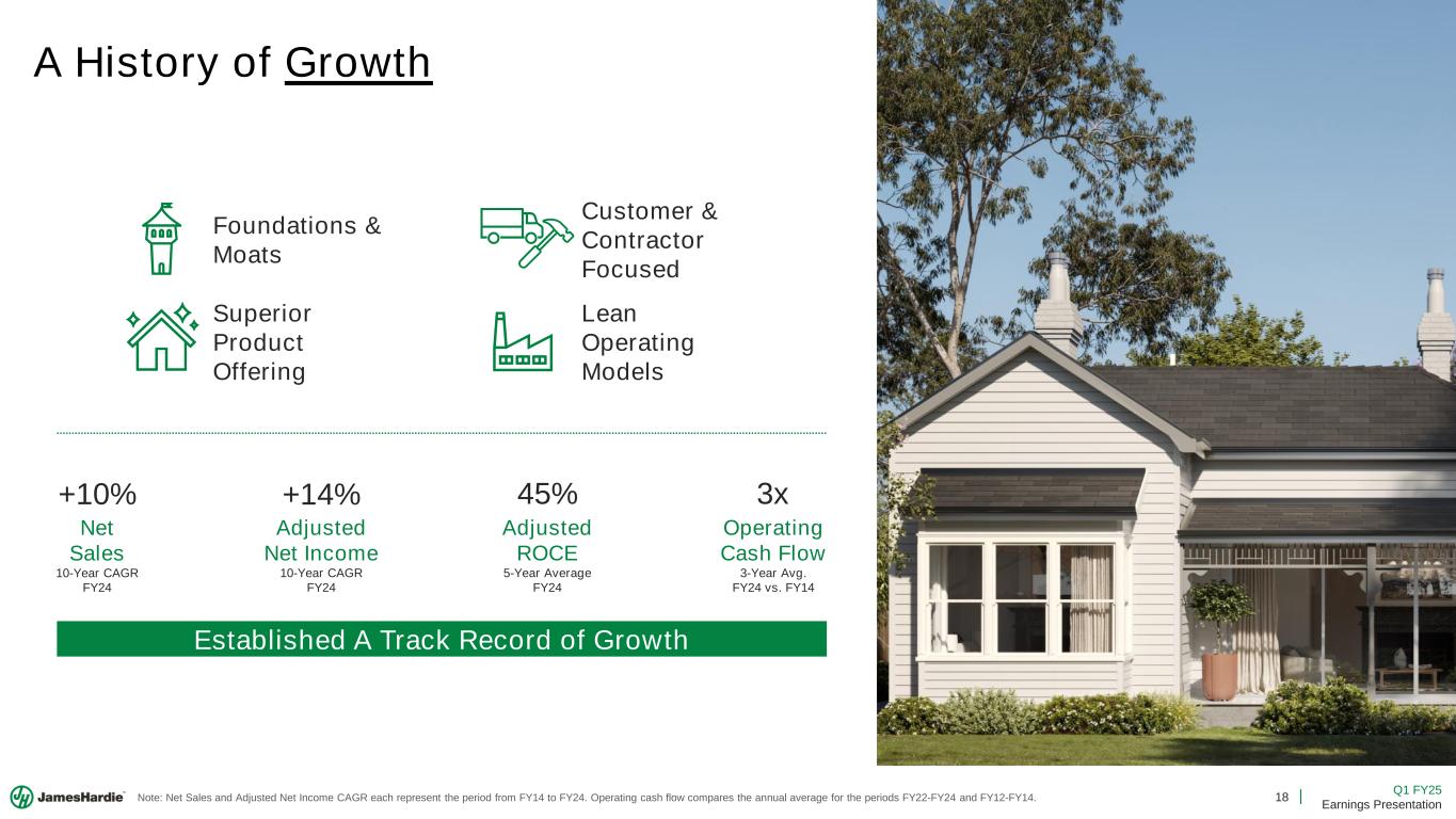 17 Q1 FY25 Earnings Presentation Cash Generation & Capital Allocation ✓ +2% Adjusted EBITDA growth ✓ Enhanced focus on prioritizing the right expenses ✓ Total liquidity of ~$1bn ✓ Net leverage ratio of 0.66x ✓ Well positioned to fund capital allocation priorities ✓ 45% Adjusted ROCE (Avg. FY20-FY24) ❑ Evaluate capacity using robust returns criteria ❑ FY2025 Capacity Actions to Support Growth ▪ Continue Prattville, AL expansion ▪ Continue Orejo, ES expansion ▪ Begin Cleburne, TX expansion ▪ Plan Crystal City, MO greenfield Generate Cash 2) Maintain Flexible Balance Sheet 1) Invest in Organic Growth ✓ Deployed $75mm to share repurchases ✓ Increased share repurchase program to $300mm ✓ $75mm available remaining on our current repurchase program 3) Deploy Excess Capital to Shareholders% ❑ Accelerate Our Current Strategy ❑ Enhance Our Value Proposition ❑ Create Long-Term Financial Value 4) Positioned for M&A To: Diligent Stewards of Investor Capital James Hardie Capital Allocation Framework