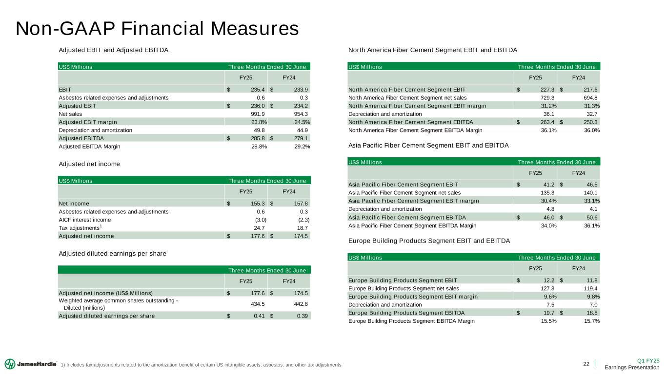 21 Q1 FY25 Earnings Presentation Non-GAAP Financial Measures This Earnings Presentation forms part of a package of information about the company’s results. It should be read in conjunction with the other parts of this package, including the Management’s Analysis of Results, Earnings Release and Condensed Consolidated Financial Statements Financial Measures – GAAP Equivalents This document contains the financial statement line item EBIT, which is considered to be non-GAAP, but is consistent with the term used by Australian companies. Because we prepare our condensed consolidated financial statements under GAAP, the equivalent GAAP financial Statement line item description used in our consolidated financial statements is Operating income (loss). EBIT – Earnings before interest and tax EBIT margin – EBIT margin is defined as EBIT as a percentage of net sales Definitions ASP – Average net sales price per msf ("ASP") – Total net sales of fiber cement and fiber gypsum products, excluding accessory sales, divided by the total volume of products sold Working Capital – The working capital calculation used in our cash provided by operating analysis includes the change in: (1) Accounts and other receivables, net; (2) Inventories; and (3) Accounts payable and accrued liabilities. ROCE - Return on Capital Employed; calculated as Adjusted EBIT / Adjusted Gross Capital Employed AICF – Asbestos Injuries Compensation Fund Ltd mmsf – sales volume in million standard feet, where a standard foot is defined as a square foot of 5/16” thickness msf – sales volume in thousand standard feet, where a standard foot is defined as a square foot of 5/16” thickness LSD – Low Single-Digits MSD – Mid-Single Digits HSD – High Single-Digits D&A – Depreciation & Amortization expense