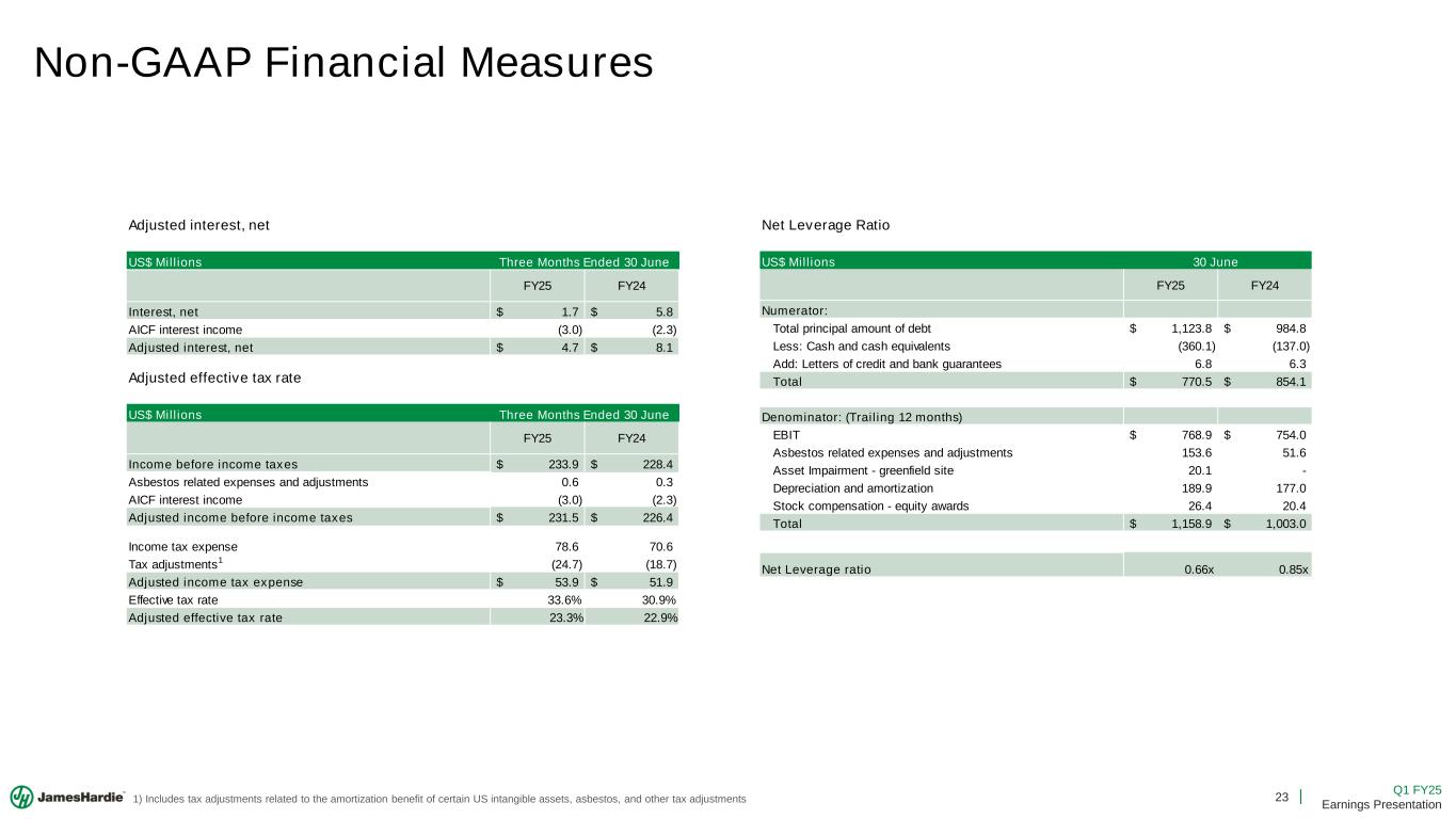 22 Q1 FY25 Earnings Presentation Non-GAAP Financial Measures Adjusted EBIT and Adjusted EBITDA US$ Millions FY25 FY24 EBIT 235.4$ 233.9$ Asbestos related expenses and adjustments 0.6 0.3 Adjusted EBIT 236.0$ 234.2$ Net sales 991.9 954.3 Adjusted EBIT margin 23.8% 24.5% Depreciation and amortization 49.8 44.9 Adjusted EBITDA 285.8$ 279.1$ Adjusted EBITDA Margin 28.8% 29.2% Three Months Ended 30 June US$ Millions FY25 FY24 Asia Pacific Fiber Cement Segment EBIT 41.2$ 46.5$ Asia Pacific Fiber Cement Segment net sales 135.3 140.1 Asia Pacific Fiber Cement Segment EBIT margin 30.4% 33.1% Depreciation and amortization 4.8 4.1 Asia Pacific Fiber Cement Segment EBITDA 46.0$ 50.6$ Asia Pacific Fiber Cement Segment EBITDA Margin 34.0% 36.1% Asia Pacific Fiber Cement Segment EBIT and EBITDA Three Months Ended 30 June US$ Millions FY25 FY24 North America Fiber Cement Segment EBIT 227.3$ 217.6$ North America Fiber Cement Segment net sales 729.3 694.8 North America Fiber Cement Segment EBIT margin 31.2% 31.3% Depreciation and amortization 36.1 32.7 North America Fiber Cement Segment EBITDA 263.4$ 250.3$ North America Fiber Cement Segment EBITDA Margin 36.1% 36.0% North America Fiber Cement Segment EBIT and EBITDA Three Months Ended 30 June Adjusted net income US$ Millions FY25 FY24 Net income 155.3$ 157.8$ Asbestos related expenses and adjustments 0.6 0.3 AICF interest income (3.0) (2.3) Tax adjustments1 24.7 18.7 Adjusted net income 177.6$ 174.5$ Three Months Ended 30 June Adjusted diluted earnings per share FY25 FY24 Adjusted net income (US$ Millions) 177.6$ 174.5$ Weighted average common shares outstanding - Diluted (millions) 434.5 442.8 Adjusted diluted earnings per share 0.41$ 0.39$ Three Months Ended 30 June 1) Includes tax adjustments related to the amortization benefit of certain US intangible assets, asbestos, and other tax adjustments US$ Millions FY25 FY24 Europe Building Products Segment EBIT 12.2$ 11.8$ Europe Building Products Segment net sales 127.3 119.4 Europe Building Products Segment EBIT margin 9.6% 9.8% Depreciation and amortization 7.5 7.0 Europe Building Products Segment EBITDA 19.7$ 18.8$ Europe Building Products Segment EBITDA Margin 15.5% 15.7% Europe Building Products Segment EBIT and EBITDA Three Months Ended 30 June