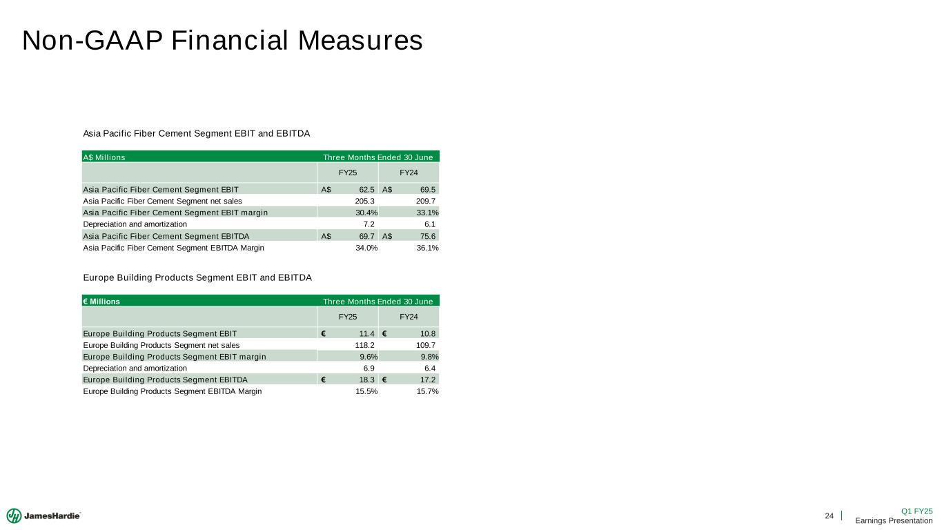 24 Q1 FY25 Earnings Presentation A$ Millions FY25 FY24 Asia Pacific Fiber Cement Segment EBIT 62.5A$ 69.5A$ Asia Pacific Fiber Cement Segment net sales 205.3 209.7 Asia Pacific Fiber Cement Segment EBIT margin 30.4% 33.1% Depreciation and amortization 7.2 6.1 Asia Pacific Fiber Cement Segment EBITDA 69.7A$ 75.6A$ Asia Pacific Fiber Cement Segment EBITDA Margin 34.0% 36.1% Asia Pacific Fiber Cement Segment EBIT and EBITDA Three Months Ended 30 June Non-GAAP Financial Measures € M FY25 FY24 Europe Building Products Segment EBIT 11.4€ 10.8€ Europe Building Products Segment net sales 118.2 109.7 Europe Building Products Segment EBIT margin 9.6% 9.8% Depreciation and amortization 6.9 6.4 Europe Building Products Segment EBITDA 18.3€ 17.2€ Europe Building Products Segment EBITDA Margin 15.5% 15.7% Europe Building Products Segment EBIT and EBITDA Three Months Ended 30 June