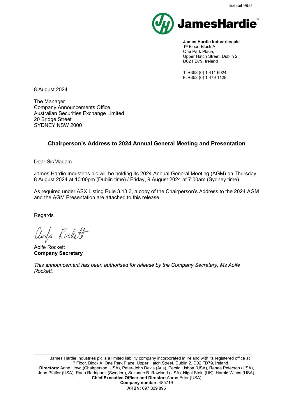 James Hardie Industries plc 1st Floor, Block A, One Park Place, Upper Hatch Street, Dublin 2, D02 FD79, Ireland T: +353 (0) 1 411 6924 F: +353 (0) 1 479 1128 James Hardie Industries plc is a limited liability company incorporated in Ireland with its registered office at 1st Floor, Block A, One Park Place, Upper Hatch Street, Dublin 2, D02 FD79, Ireland. Directors: Anne Lloyd (Chairperson, USA), Peter-John Davis (Aus), Persio Lisboa (USA), Renee Peterson (USA), John Pfeifer (USA), Rada Rodriguez (Sweden), Suzanne B. Rowland (USA), Nigel Stein (UK), Harold Wiens (USA). Chief Executive Officer and Director: Aaron Erter (USA) Company number: 485719 ARBN: 097 829 895 8 August 2024 The Manager Company Announcements Office Australian Securities Exchange Limited 20 Bridge Street SYDNEY NSW 2000 Chairperson’s Address to 2024 Annual General Meeting and Presentation Dear Sir/Madam James Hardie Industries plc will be holding its 2024 Annual General Meeting (AGM) on Thursday, 8 August 2024 at 10:00pm (Dublin time) / Friday, 9 August 2024 at 7:00am (Sydney time). As required under ASX Listing Rule 3.13.3, a copy of the Chairperson’s Address to the 2024 AGM and the AGM Presentation are attached to this release. Regards Aoife Rockett Company Secretary This announcement has been authorised for release by the Company Secretary, Ms Aoife Rockett. Exhibit 99.6