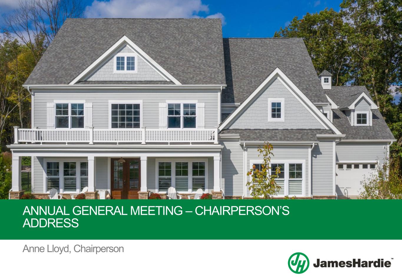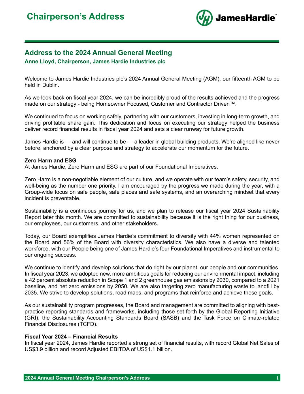 Chairperson’s Address 2024 Annual General Meeting Chairperson’s Address 1 Address to the 2024 Annual General Meeting Anne Lloyd, Chairperson, James Hardie Industries plc Welcome to James Hardie Industries plc’s 2024 Annual General Meeting (AGM), our fifteenth AGM to be held in Dublin. As we look back on fiscal year 2024, we can be incredibly proud of the results achieved and the progress made on our strategy - being Homeowner Focused, Customer and Contractor Driven™. We continued to focus on working safely, partnering with our customers, investing in long-term growth, and driving profitable share gain. This dedication and focus on executing our strategy helped the business deliver record financial results in fiscal year 2024 and sets a clear runway for future growth. James Hardie is — and will continue to be — a leader in global building products. We’re aligned like never before, anchored by a clear purpose and strategy to accelerate our momentum for the future. Zero Harm and ESG At James Hardie, Zero Harm and ESG are part of our Foundational Imperatives. Zero Harm is a non-negotiable element of our culture, and we operate with our team’s safety, security, and well-being as the number one priority. I am encouraged by the progress we made during the year, with a Group-wide focus on safe people, safe places and safe systems, and an overarching mindset that every incident is preventable. Sustainability is a continuous journey for us, and we plan to release our fiscal year 2024 Sustainability Report later this month. We are committed to sustainability because it is the right thing for our business, our employees, our customers, and other stakeholders. Today, our Board exemplifies James Hardie’s commitment to diversity with 44% women represented on the Board and 56% of the Board with diversity characteristics. We also have a diverse and talented workforce, with our People being one of James Hardie’s four Foundational Imperatives and instrumental to our ongoing success. We continue to identify and develop solutions that do right by our planet, our people and our communities. In fiscal year 2023, we adopted new, more ambitious goals for reducing our environmental impact, including a 42 percent absolute reduction in Scope 1 and 2 greenhouse gas emissions by 2030, compared to a 2021 baseline, and net zero emissions by 2050. We are also targeting zero manufacturing waste to landfill by 2035. We strive to develop solutions, road maps, and programs that reinforce and achieve these goals. As our sustainability program progresses, the Board and management are committed to aligning with best- practice reporting standards and frameworks, including those set forth by the Global Reporting Initiative (GRI), the Sustainability Accounting Standards Board (SASB) and the Task Force on Climate-related Financial Disclosures (TCFD). Fiscal Year 2024 – Financial Results In fiscal year 2024, James Hardie reported a strong set of financial results, with record Global Net Sales of US$3.9 billion and record Adjusted EBITDA of US$1.1 billion.