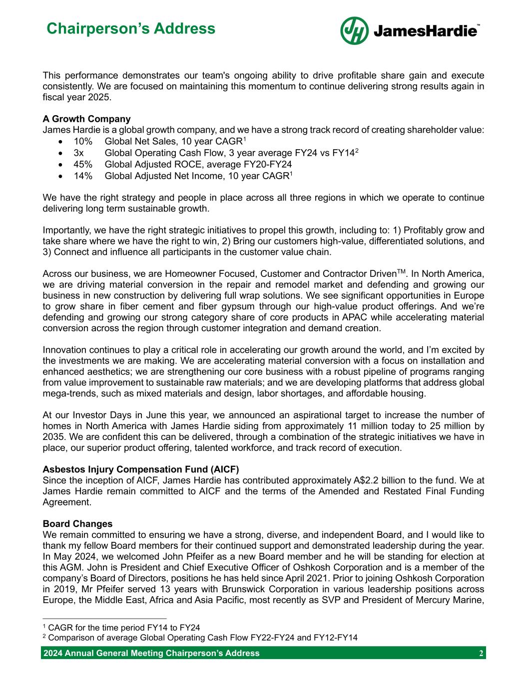 Chairperson’s Address 2024 Annual General Meeting Chairperson’s Address 2 This performance demonstrates our team's ongoing ability to drive profitable share gain and execute consistently. We are focused on maintaining this momentum to continue delivering strong results again in fiscal year 2025. A Growth Company James Hardie is a global growth company, and we have a strong track record of creating shareholder value: • 10% Global Net Sales, 10 year CAGR1 • 3x Global Operating Cash Flow, 3 year average FY24 vs FY142 • 45% Global Adjusted ROCE, average FY20-FY24 • 14% Global Adjusted Net Income, 10 year CAGR1 We have the right strategy and people in place across all three regions in which we operate to continue delivering long term sustainable growth. Importantly, we have the right strategic initiatives to propel this growth, including to: 1) Profitably grow and take share where we have the right to win, 2) Bring our customers high-value, differentiated solutions, and 3) Connect and influence all participants in the customer value chain. Across our business, we are Homeowner Focused, Customer and Contractor DrivenTM. In North America, we are driving material conversion in the repair and remodel market and defending and growing our business in new construction by delivering full wrap solutions. We see significant opportunities in Europe to grow share in fiber cement and fiber gypsum through our high-value product offerings. And we’re defending and growing our strong category share of core products in APAC while accelerating material conversion across the region through customer integration and demand creation. Innovation continues to play a critical role in accelerating our growth around the world, and I’m excited by the investments we are making. We are accelerating material conversion with a focus on installation and enhanced aesthetics; we are strengthening our core business with a robust pipeline of programs ranging from value improvement to sustainable raw materials; and we are developing platforms that address global mega-trends, such as mixed materials and design, labor shortages, and affordable housing. At our Investor Days in June this year, we announced an aspirational target to increase the number of homes in North America with James Hardie siding from approximately 11 million today to 25 million by 2035. We are confident this can be delivered, through a combination of the strategic initiatives we have in place, our superior product offering, talented workforce, and track record of execution. Asbestos Injury Compensation Fund (AICF) Since the inception of AICF, James Hardie has contributed approximately A$2.2 billion to the fund. We at James Hardie remain committed to AICF and the terms of the Amended and Restated Final Funding Agreement. Board Changes We remain committed to ensuring we have a strong, diverse, and independent Board, and I would like to thank my fellow Board members for their continued support and demonstrated leadership during the year. In May 2024, we welcomed John Pfeifer as a new Board member and he will be standing for election at this AGM. John is President and Chief Executive Officer of Oshkosh Corporation and is a member of the company’s Board of Directors, positions he has held since April 2021. Prior to joining Oshkosh Corporation in 2019, Mr Pfeifer served 13 years with Brunswick Corporation in various leadership positions across Europe, the Middle East, Africa and Asia Pacific, most recently as SVP and President of Mercury Marine, 1 CAGR for the time period FY14 to FY24 2 Comparison of average Global Operating Cash Flow FY22-FY24 and FY12-FY14