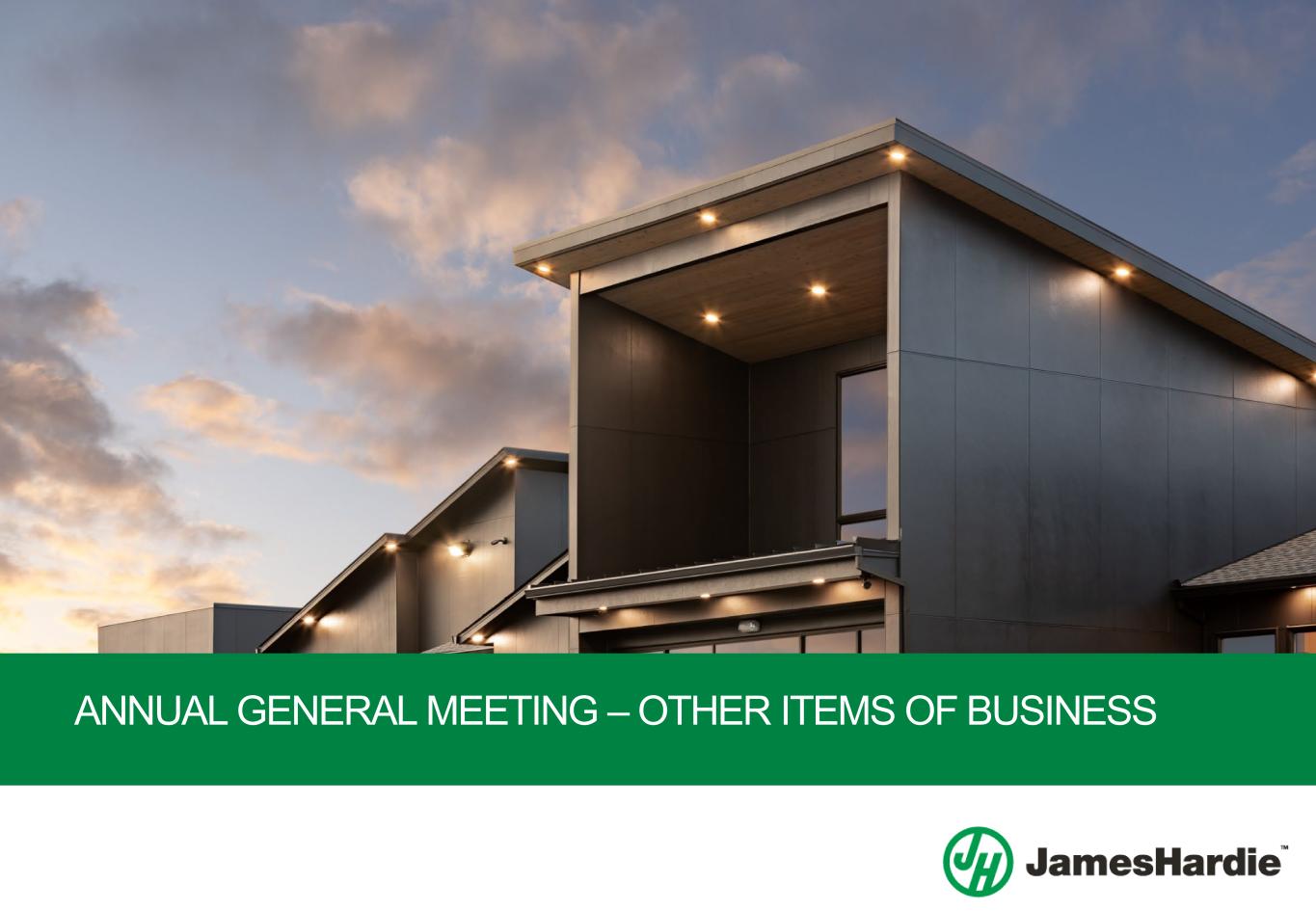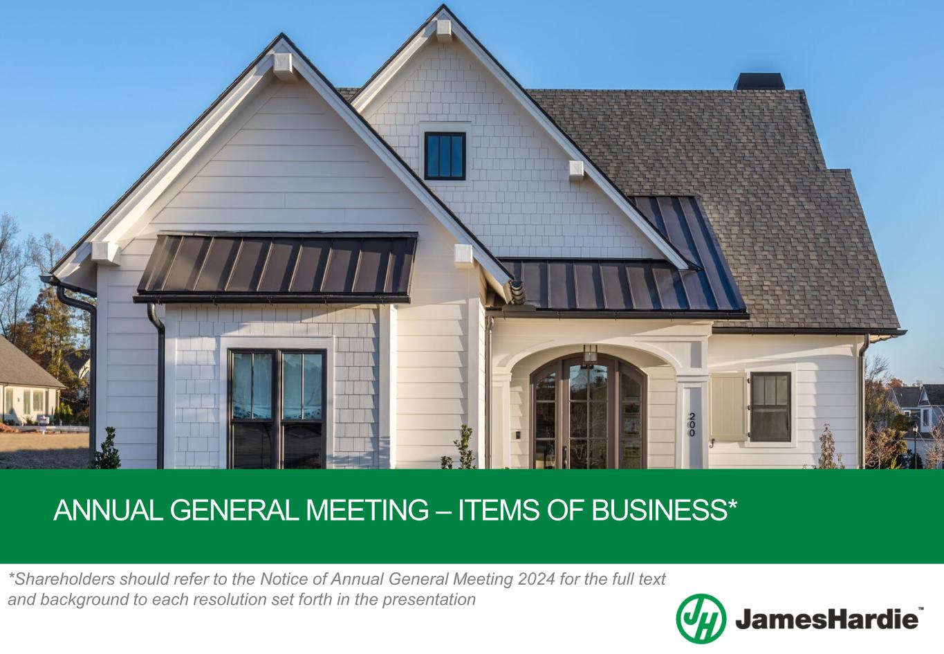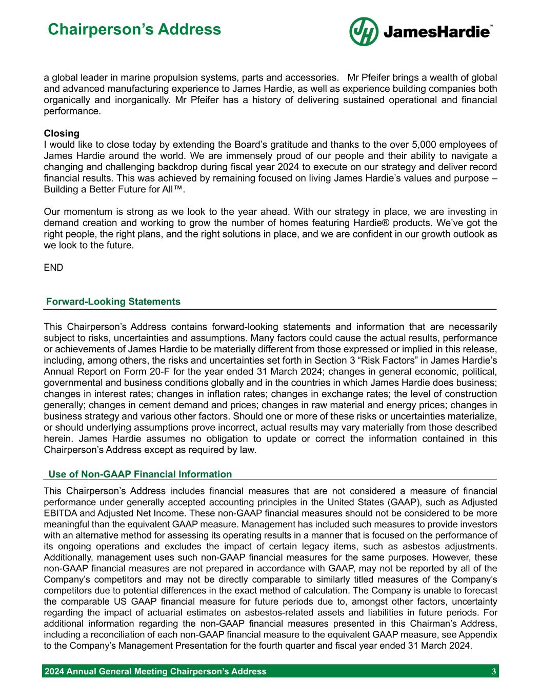 Chairperson’s Address 2024 Annual General Meeting Chairperson’s Address 3 a global leader in marine propulsion systems, parts and accessories. Mr Pfeifer brings a wealth of global and advanced manufacturing experience to James Hardie, as well as experience building companies both organically and inorganically. Mr Pfeifer has a history of delivering sustained operational and financial performance. Closing I would like to close today by extending the Board’s gratitude and thanks to the over 5,000 employees of James Hardie around the world. We are immensely proud of our people and their ability to navigate a changing and challenging backdrop during fiscal year 2024 to execute on our strategy and deliver record financial results. This was achieved by remaining focused on living James Hardie’s values and purpose – Building a Better Future for All™. Our momentum is strong as we look to the year ahead. With our strategy in place, we are investing in demand creation and working to grow the number of homes featuring Hardie® products. We’ve got the right people, the right plans, and the right solutions in place, and we are confident in our growth outlook as we look to the future. END Forward-Looking Statements This Chairperson’s Address contains forward-looking statements and information that are necessarily subject to risks, uncertainties and assumptions. Many factors could cause the actual results, performance or achievements of James Hardie to be materially different from those expressed or implied in this release, including, among others, the risks and uncertainties set forth in Section 3 “Risk Factors” in James Hardie’s Annual Report on Form 20-F for the year ended 31 March 2024; changes in general economic, political, governmental and business conditions globally and in the countries in which James Hardie does business; changes in interest rates; changes in inflation rates; changes in exchange rates; the level of construction generally; changes in cement demand and prices; changes in raw material and energy prices; changes in business strategy and various other factors. Should one or more of these risks or uncertainties materialize, or should underlying assumptions prove incorrect, actual results may vary materially from those described herein. James Hardie assumes no obligation to update or correct the information contained in this Chairperson’s Address except as required by law. Use of Non-GAAP Financial Information This Chairperson’s Address includes financial measures that are not considered a measure of financial performance under generally accepted accounting principles in the United States (GAAP), such as Adjusted EBITDA and Adjusted Net Income. These non-GAAP financial measures should not be considered to be more meaningful than the equivalent GAAP measure. Management has included such measures to provide investors with an alternative method for assessing its operating results in a manner that is focused on the performance of its ongoing operations and excludes the impact of certain legacy items, such as asbestos adjustments. Additionally, management uses such non-GAAP financial measures for the same purposes. However, these non-GAAP financial measures are not prepared in accordance with GAAP, may not be reported by all of the Company’s competitors and may not be directly comparable to similarly titled measures of the Company’s competitors due to potential differences in the exact method of calculation. The Company is unable to forecast the comparable US GAAP financial measure for future periods due to, amongst other factors, uncertainty regarding the impact of actuarial estimates on asbestos-related assets and liabilities in future periods. For additional information regarding the non-GAAP financial measures presented in this Chairman’s Address, including a reconciliation of each non-GAAP financial measure to the equivalent GAAP measure, see Appendix to the Company’s Management Presentation for the fourth quarter and fiscal year ended 31 March 2024.