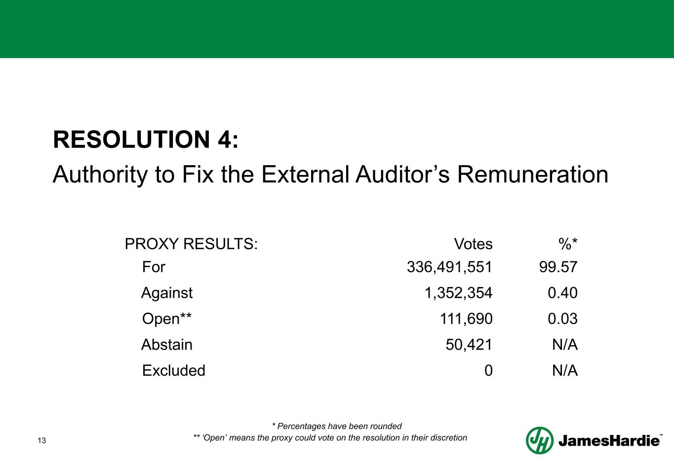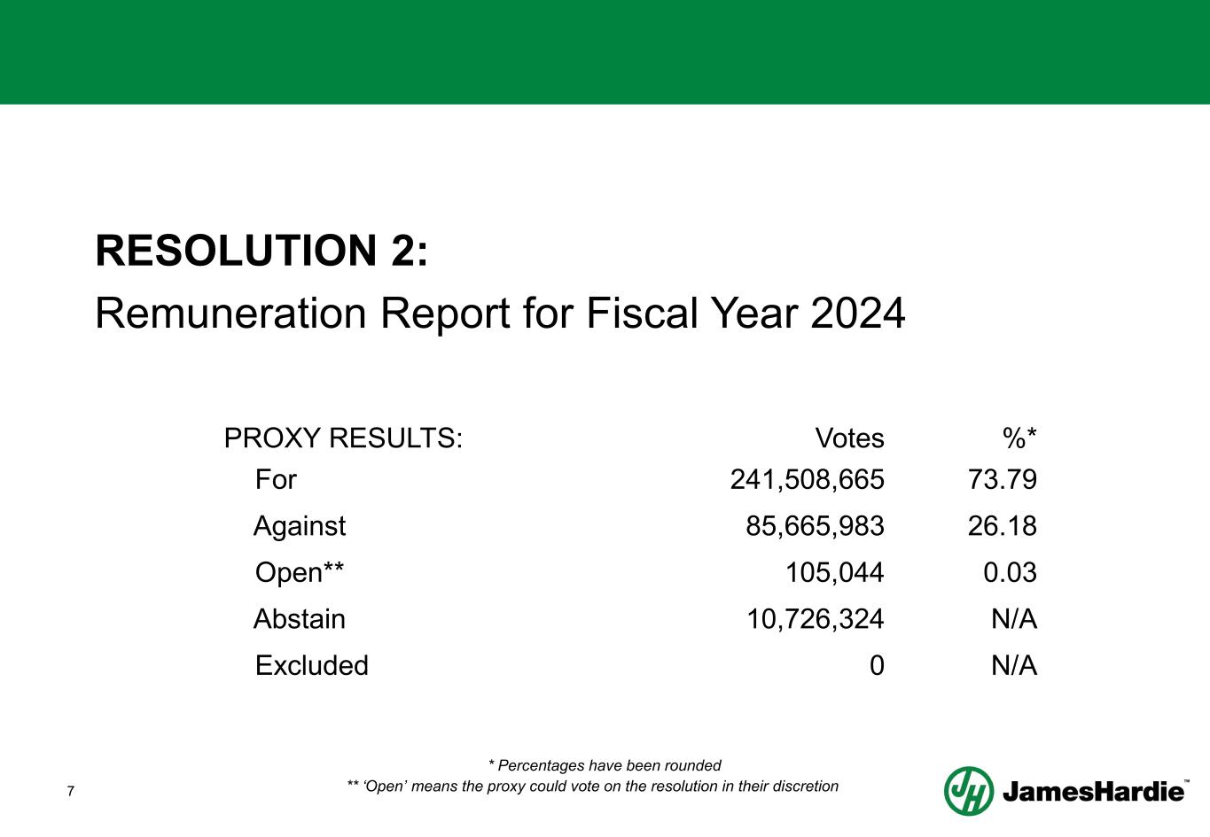23 RESOLUTION 9: Issue of Shares under the James Hardie 2020 NED Equity Plan PROXY RESULTS: Votes %* For 326,244,568 96.57 Against 11,476,705 3.40 Open** 105,044 0.03 Abstain 179,699 N/A Excluded 0 N/A * Percentages have been rounded ** ‘Open’ means the proxy could vote on the resolution in their discretion