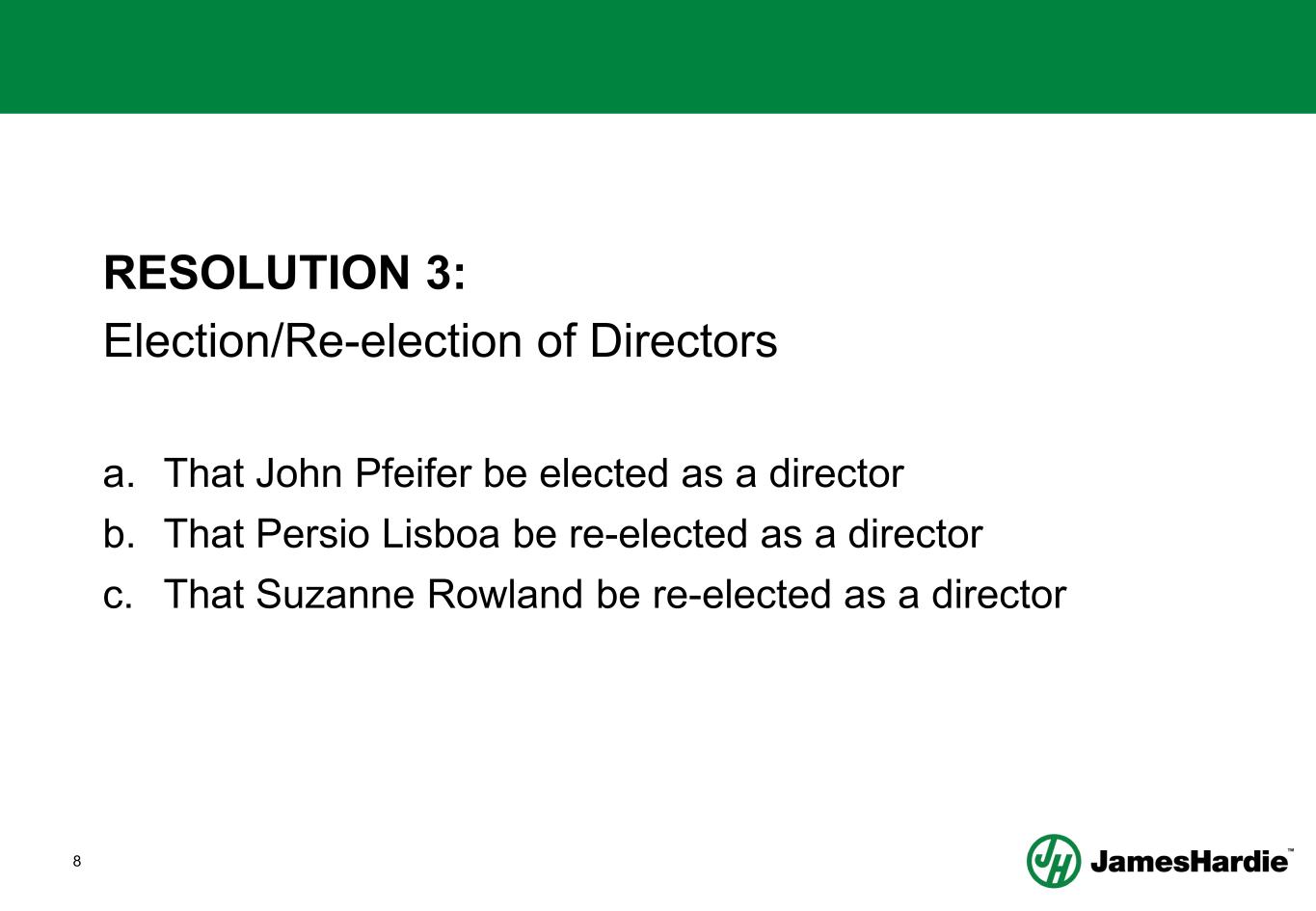 8 RESOLUTION 3: Election/Re-election of Directors a. That John Pfeifer be elected as a director b. That Persio Lisboa be re-elected as a director c. That Suzanne Rowland be re-elected as a director