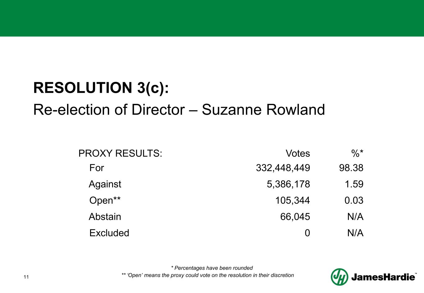 10 RESOLUTION 3(b): Re-election of Director – Persio Lisboa PROXY RESULTS: Votes %* For 328,366,722 97.18 Against 9,441,844 2.79 Open** 113,712 0.03 Abstain 83,738 N/A Excluded 0 N/A * Percentages have been rounded ** ‘Open’ means the proxy could vote on the resolution in their discretion