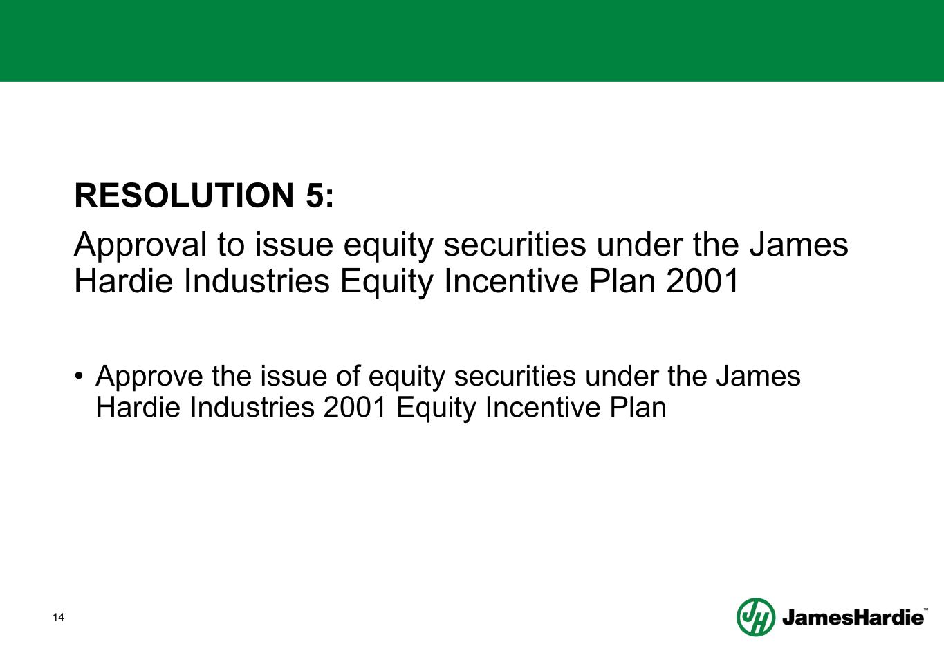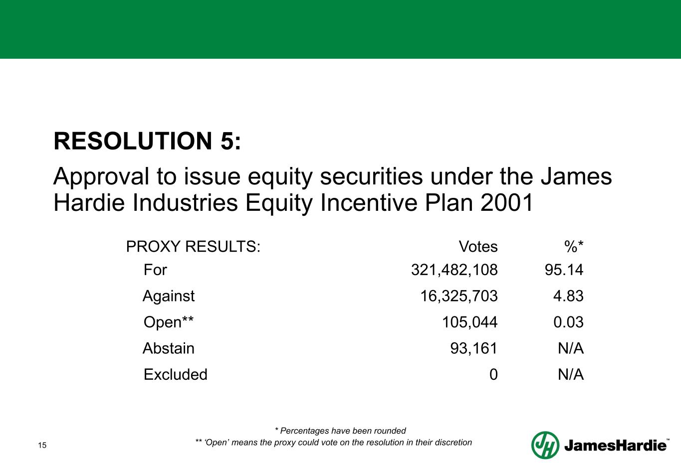 14 RESOLUTION 5: Approval to issue equity securities under the James Hardie Industries Equity Incentive Plan 2001 • Approve the issue of equity securities under the James Hardie Industries 2001 Equity Incentive Plan