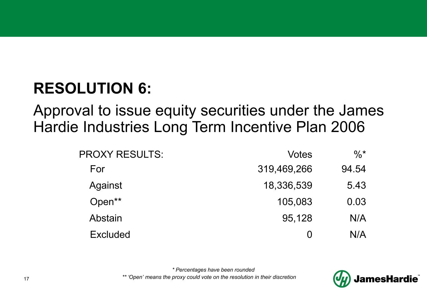 17 RESOLUTION 6: Approval to issue equity securities under the James Hardie Industries Long Term Incentive Plan 2006 PROXY RESULTS: Votes %* For 319,469,266 94.54 Against 18,336,539 5.43 Open** 105,083 0.03 Abstain 95,128 N/A Excluded 0 N/A * Percentages have been rounded ** ‘Open’ means the proxy could vote on the resolution in their discretion