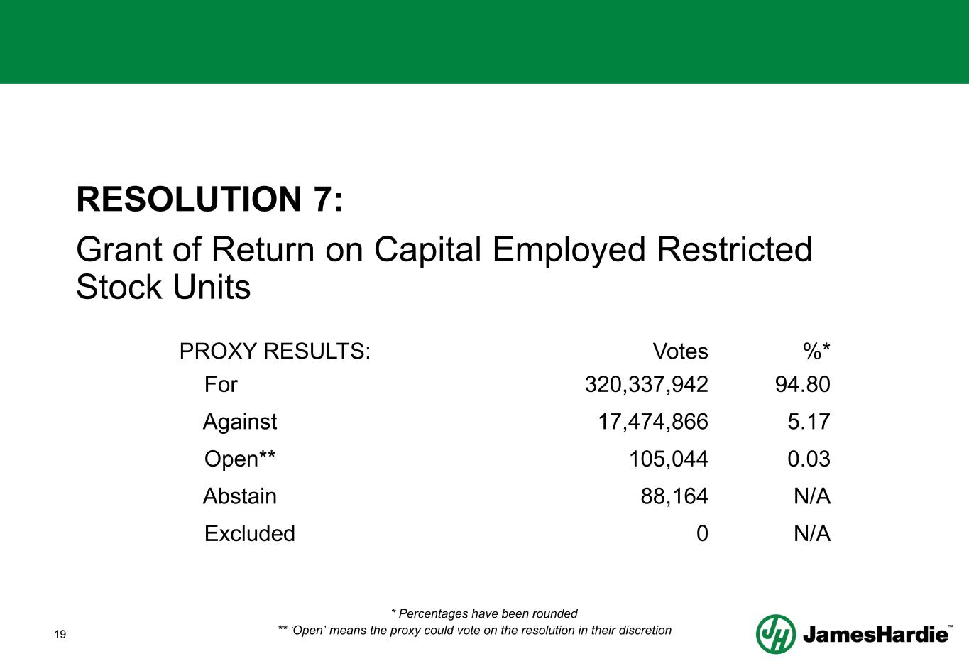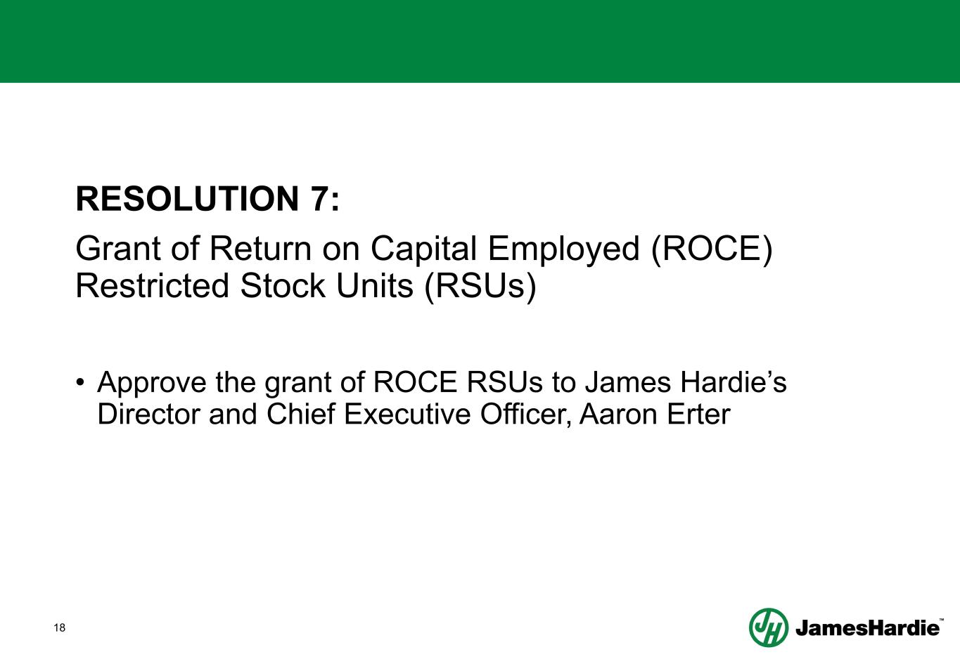 18 RESOLUTION 7: Grant of Return on Capital Employed (ROCE) Restricted Stock Units (RSUs) • Approve the grant of ROCE RSUs to James Hardie’s Director and Chief Executive Officer, Aaron Erter