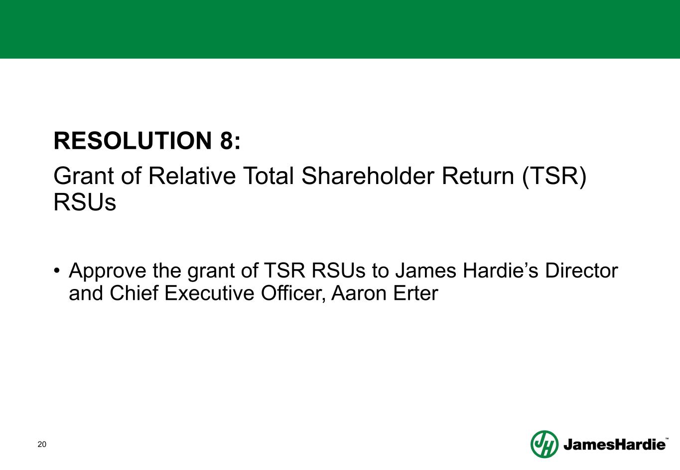 20 RESOLUTION 8: Grant of Relative Total Shareholder Return (TSR) RSUs • Approve the grant of TSR RSUs to James Hardie’s Director and Chief Executive Officer, Aaron Erter