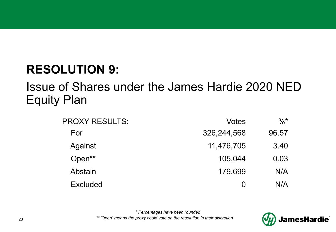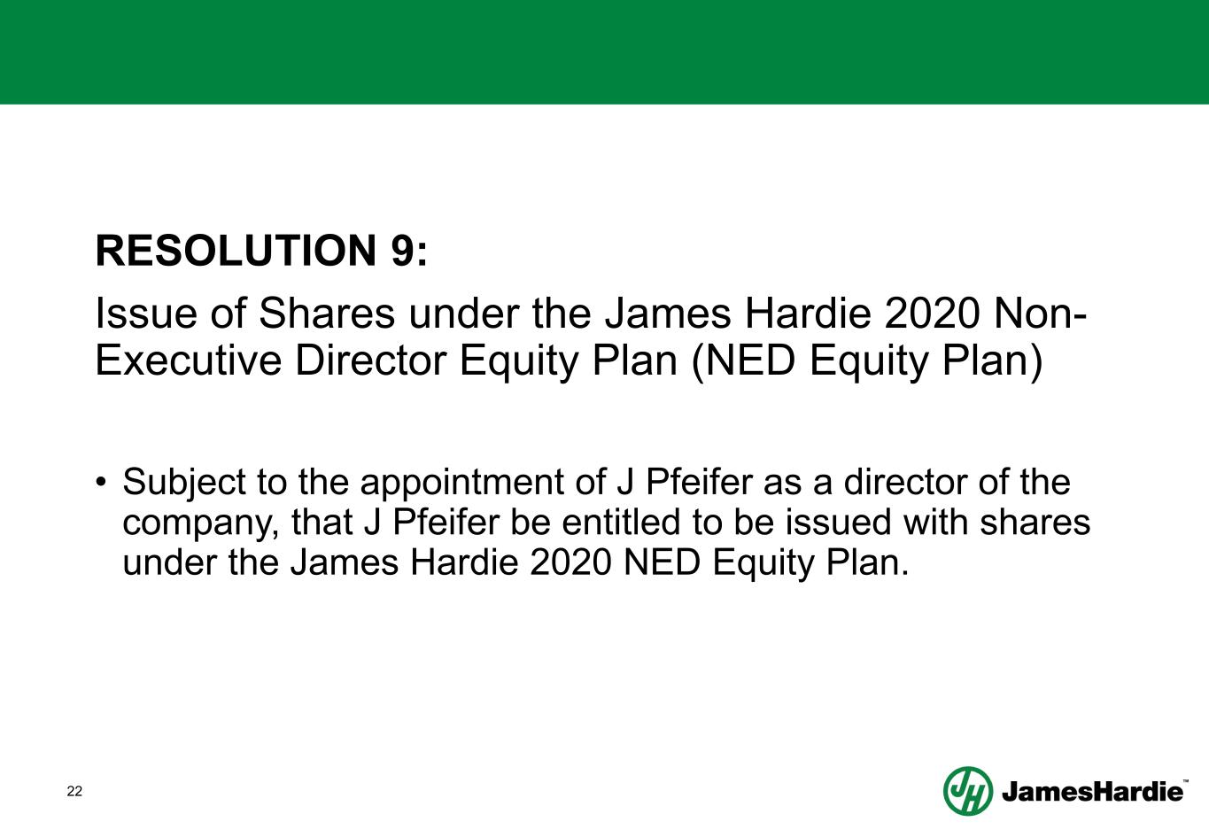 22 RESOLUTION 9: Issue of Shares under the James Hardie 2020 Non- Executive Director Equity Plan (NED Equity Plan) • Subject to the appointment of J Pfeifer as a director of the company, that J Pfeifer be entitled to be issued with shares under the James Hardie 2020 NED Equity Plan.