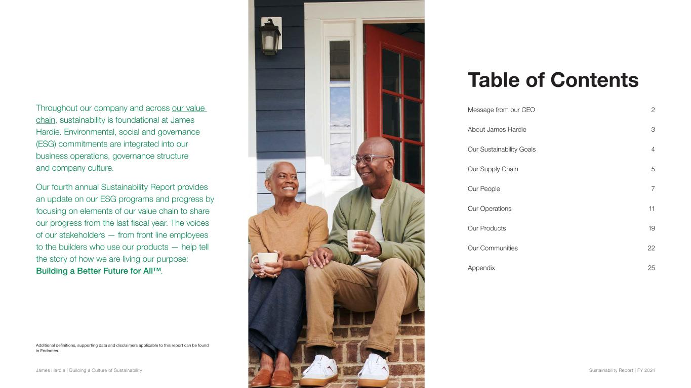 Throughout our company and across our value chain, sustainability is foundational at James Hardie. Environmental, social and governance (ESG) commitments are integrated into our business operations, governance structure and company culture. Our fourth annual Sustainability Report provides an update on our ESG programs and progress by focusing on elements of our value chain to share our progress from the last fiscal year. The voices of our stakeholders — from front line employees to the builders who use our products — help tell the story of how we are living our purpose: Building a Better Future for All™. Table of Contents Message from our CEO 2 About James Hardie 3 Our Sustainability Goals 4 Our Supply Chain 5 Our People 7 Our Operations 11 Our Products 19 Our Communities 22 Appendix 25 Additional definitions, supporting data and disclaimers applicable to this report can be found in Endnotes. James Hardie | Building a Culture of Sustainability Sustainability Repor t | FY 2024