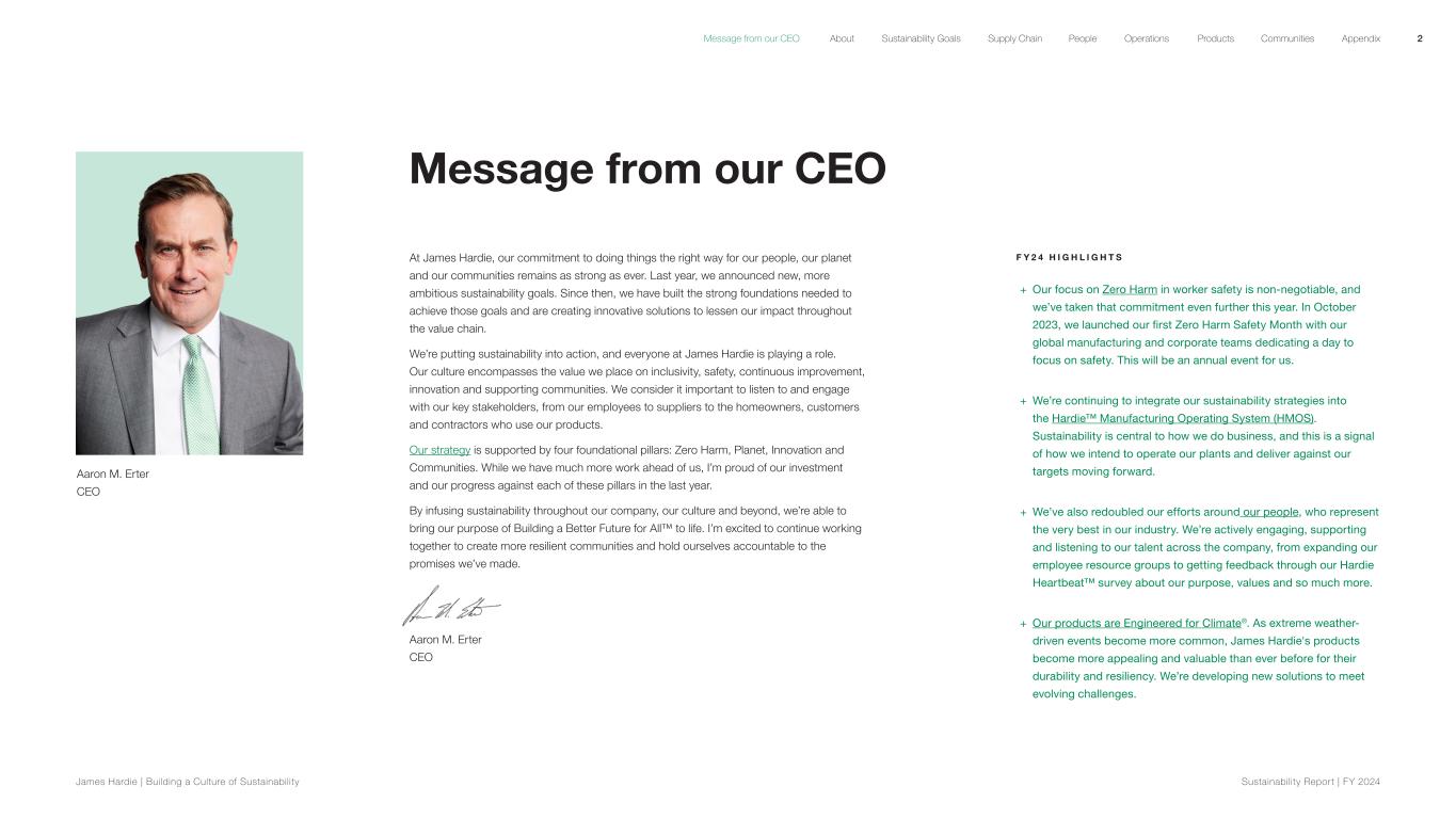 Message from our CEO At James Hardie, our commitment to doing things the right way for our people, our planet and our communities remains as strong as ever. Last year, we announced new, more ambitious sustainability goals. Since then, we have built the strong foundations needed to achieve those goals and are creating innovative solutions to lessen our impact throughout the value chain. We’re putting sustainability into action, and everyone at James Hardie is playing a role. Our culture encompasses the value we place on inclusivity, safety, continuous improvement, innovation and supporting communities. We consider it important to listen to and engage with our key stakeholders, from our employees to suppliers to the homeowners, customers and contractors who use our products. Our strategy is supported by four foundational pillars: Zero Harm, Planet, Innovation and Communities. While we have much more work ahead of us, I’m proud of our investment and our progress against each of these pillars in the last year. By infusing sustainability throughout our company, our culture and beyond, we’re able to bring our purpose of Building a Better Future for All™ to life. I’m excited to continue working together to create more resilient communities and hold ourselves accountable to the promises we’ve made. Aaron M. Erter CEO F Y 2 4 H I G H L I G H T S + Our focus on Zero Harm in worker safety is non-negotiable, and we’ve taken that commitment even further this year. In October 2023, we launched our first Zero Harm Safety Month with our global manufacturing and corporate teams dedicating a day to focus on safety. This will be an annual event for us. + We’re continuing to integrate our sustainability strategies into the Hardie™ Manufacturing Operating System (HMOS). Sustainability is central to how we do business, and this is a signal of how we intend to operate our plants and deliver against our targets moving forward. + We’ve also redoubled our efforts around our people, who represent the very best in our industry. We’re actively engaging, supporting and listening to our talent across the company, from expanding our employee resource groups to getting feedback through our Hardie Heartbeat™ survey about our purpose, values and so much more. + Our products are Engineered for Climate®. As extreme weather- driven events become more common, James Hardie's products become more appealing and valuable than ever before for their durability and resiliency. We’re developing new solutions to meet evolving challenges. Aaron M. Erter CEO 2 James Hardie | Building a Culture of Sustainability Sustainability Repor t | FY 2024 About Sustainability Goals Supply Chain OperationsMessage from our CEO People Products Communities Appendix