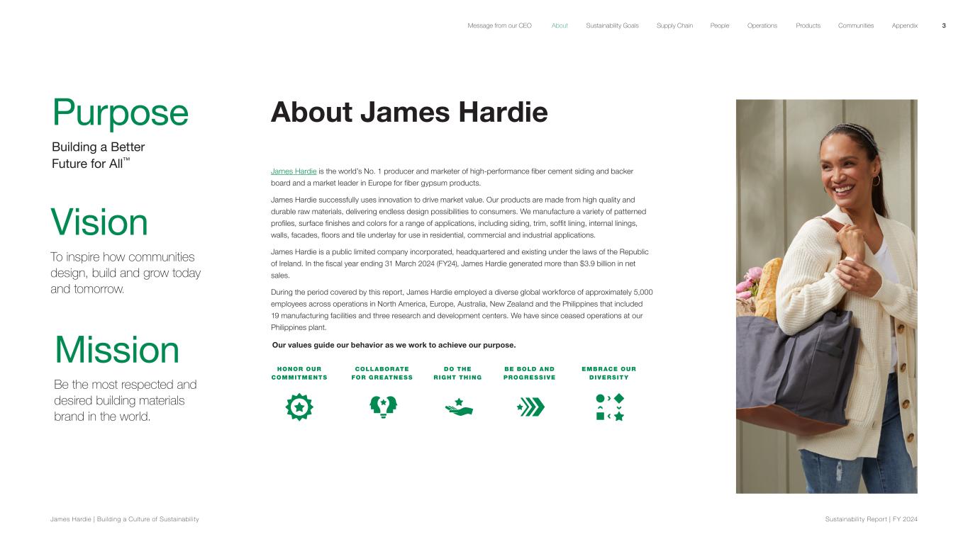 About James Hardie James Hardie is the world’s No. 1 producer and marketer of high-performance fiber cement siding and backer board and a market leader in Europe for fiber gypsum products. James Hardie successfully uses innovation to drive market value. Our products are made from high quality and durable raw materials, delivering endless design possibilities to consumers. We manufacture a variety of patterned profiles, surface finishes and colors for a range of applications, including siding, trim, soffit lining, internal linings, walls, facades, floors and tile underlay for use in residential, commercial and industrial applications. James Hardie is a public limited company incorporated, headquartered and existing under the laws of the Republic of Ireland. In the fiscal year ending 31 March 2024 (FY24), James Hardie generated more than $3.9 billion in net sales. During the period covered by this report, James Hardie employed a diverse global workforce of approximately 5,000 employees across operations in North America, Europe, Australia, New Zealand and the Philippines that included 19 manufacturing facilities and three research and development centers. We have since ceased operations at our Philippines plant. Purpose Building a Better Future for All™ Our values guide our behavior as we work to achieve our purpose. HONOR OUR COMMITMENTS BE BOLD AND PROGRESSIVE EMBRACE OUR DIVERSITY COLLABORATE FOR GREATNESS DO THE R IGHT THING Vision To inspire how communities design, build and grow today and tomorrow. Mission Be the most respected and desired building materials brand in the world. 3 James Hardie | Building a Culture of Sustainability Sustainability Repor t | FY 2024 About Sustainability Goals Supply Chain OperationsMessage from our CEO People Products Communities Appendix