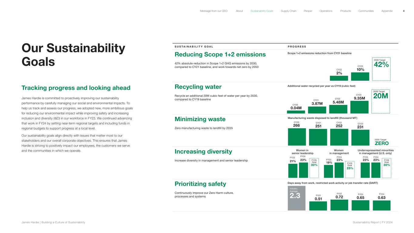 Our Sustainability Goals Tracking progress and looking ahead James Hardie is committed to proactively improving our sustainability performance by carefully managing our social and environmental impacts. To help us track and assess our progress, we adopted new, more ambitious goals for reducing our environmental impact while improving safety and increasing inclusion and diversity (I&D) in our workforce in FY23. We continued advancing that work in FY24 by setting near-term regional targets and including funds in regional budgets to support progress at a local level. Our sustainability goals align directly with issues that matter most to our stakeholders and our overall corporate objectives. This ensures that James Hardie is striving to positively impact our employees, the customers we serve and the communities in which we operate. S U S T A I N A B I L I T Y G O A L P R O G R E S S Reducing Scope 1+2 emissions 42% absolute reduction in Scope 1+2 GHG emissions by 2030, compared to CY21 baseline, and work towards net zero by 2050 Recycling water Recycle an additional 20M cubic feet of water per year by 2030, compared to CY19 baseline Minimizing waste Zero manufacturing waste to landfill by 2035 Increasing diversity Increase diversity in management and senior leadership Prioritizing safety Continuously improve our Zero Harm culture, processes and systems 4 James Hardie | Building a Culture of Sustainability Sustainability Repor t | FY 2024 About Sustainability Goals Supply Chain OperationsMessage from our CEO People Products Communities Appendix 2030 Target 42% 2% CY22 10% CY23 Scope 1+2 emissions reduction from CY21 baseline 2030 Target 20M CY20 0.04M CY21 3.87M CY22 5.48M CY23 9.35M Additional water recycled per year vs CY19 (cubic feet) 2035 Target ZERO CY22 252 CY23 231266 CY20 251 CY21 Manufacturing waste disposed to landfill (thousand MT) Women in senior leadership FY26 Goal 30% FY24 23% FY23 21% Women in management FY26 Goal 25% FY24 23%FY23 19% Underrepresented minorities in management (U.S. only) FY26 Goal 30% FY24 23% FY23 23% Industry Average 2.3 Days away from work, restricted work activity or job transfer rate (DART) FY23 0.65 FY24 0.63 FY22 0.72FY21 0.51