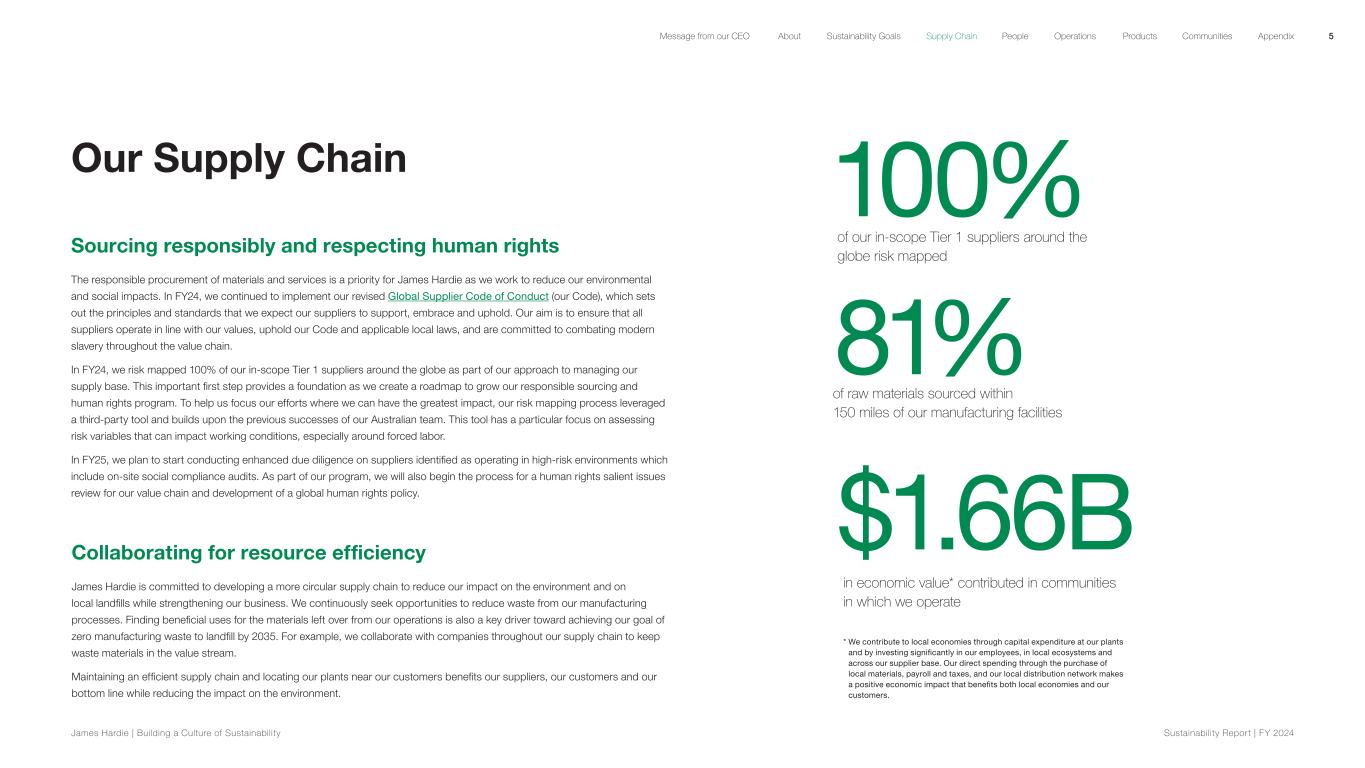 Our Supply Chain 100% of our in-scope Tier 1 suppliers around the globe risk mapped Collaborating for resource efficiency James Hardie is committed to developing a more circular supply chain to reduce our impact on the environment and on local landfills while strengthening our business. We continuously seek opportunities to reduce waste from our manufacturing processes. Finding beneficial uses for the materials left over from our operations is also a key driver toward achieving our goal of zero manufacturing waste to landfill by 2035. For example, we collaborate with companies throughout our supply chain to keep waste materials in the value stream. Maintaining an efficient supply chain and locating our plants near our customers benefits our suppliers, our customers and our bottom line while reducing the impact on the environment. 81% of raw materials sourced within 150 miles of our manufacturing facilities $1.66B in economic value* contributed in communities in which we operate Sourcing responsibly and respecting human rights The responsible procurement of materials and services is a priority for James Hardie as we work to reduce our environmental and social impacts. In FY24, we continued to implement our revised Global Supplier Code of Conduct (our Code), which sets out the principles and standards that we expect our suppliers to support, embrace and uphold. Our aim is to ensure that all suppliers operate in line with our values, uphold our Code and applicable local laws, and are committed to combating modern slavery throughout the value chain. In FY24, we risk mapped 100% of our in-scope Tier 1 suppliers around the globe as part of our approach to managing our supply base. This important first step provides a foundation as we create a roadmap to grow our responsible sourcing and human rights program. To help us focus our efforts where we can have the greatest impact, our risk mapping process leveraged a third-party tool and builds upon the previous successes of our Australian team. This tool has a particular focus on assessing risk variables that can impact working conditions, especially around forced labor. In FY25, we plan to start conducting enhanced due diligence on suppliers identified as operating in high-risk environments which include on-site social compliance audits. As part of our program, we will also begin the process for a human rights salient issues review for our value chain and development of a global human rights policy. * We contribute to local economies through capital expenditure at our plants and by investing significantly in our employees, in local ecosystems and across our supplier base. Our direct spending through the purchase of local materials, payroll and taxes, and our local distribution network makes a positive economic impact that benefits both local economies and our customers. 5 James Hardie | Building a Culture of Sustainability Sustainability Repor t | FY 2024 About Sustainability Goals Supply Chain OperationsMessage from our CEO People Products Communities Appendix