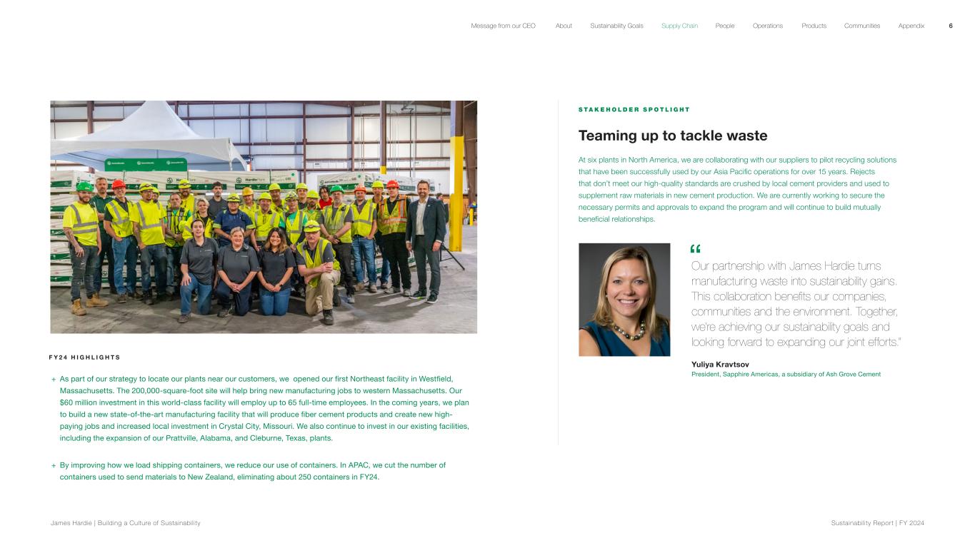 F Y 2 4 H I G H L I G H T S + As part of our strategy to locate our plants near our customers, we opened our first Northeast facility in Westfield, Massachusetts. The 200,000-square-foot site will help bring new manufacturing jobs to western Massachusetts. Our $60 million investment in this world-class facility will employ up to 65 full-time employees. In the coming years, we plan to build a new state-of-the-art manufacturing facility that will produce fiber cement products and create new high- paying jobs and increased local investment in Crystal City, Missouri. We also continue to invest in our existing facilities, including the expansion of our Prattville, Alabama, and Cleburne, Texas, plants. + By improving how we load shipping containers, we reduce our use of containers. In APAC, we cut the number of containers used to send materials to New Zealand, eliminating about 250 containers in FY24. S TA K E H O L D E R S P O T L I G H T Teaming up to tackle waste At six plants in North America, we are collaborating with our suppliers to pilot recycling solutions that have been successfully used by our Asia Pacific operations for over 15 years. Rejects that don’t meet our high-quality standards are crushed by local cement providers and used to supplement raw materials in new cement production. We are currently working to secure the necessary permits and approvals to expand the program and will continue to build mutually beneficial relationships. Our partnership with James Hardie turns manufacturing waste into sustainability gains. This collaboration benefits our companies, communities and the environment. Together, we’re achieving our sustainability goals and looking forward to expanding our joint efforts." Yuliya Kravtsov President, Sapphire Americas, a subsidiary of Ash Grove Cement 6 James Hardie | Building a Culture of Sustainability Sustainability Repor t | FY 2024 About Sustainability Goals Supply Chain OperationsMessage from our CEO People Products Communities Appendix