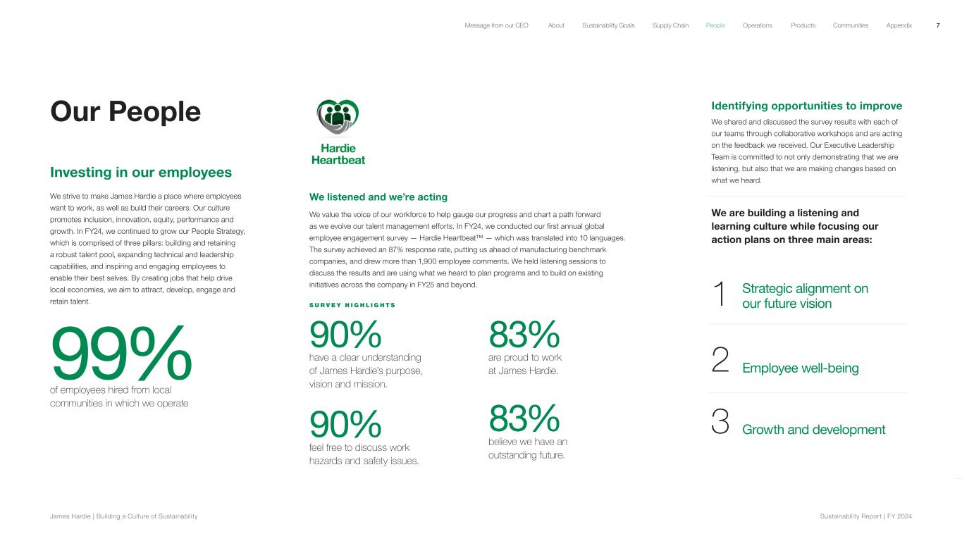 Our People Investing in our employees We strive to make James Hardie a place where employees want to work, as well as build their careers. Our culture promotes inclusion, innovation, equity, performance and growth. In FY24, we continued to grow our People Strategy, which is comprised of three pillars: building and retaining a robust talent pool, expanding technical and leadership capabilities, and inspiring and engaging employees to enable their best selves. By creating jobs that help drive local economies, we aim to attract, develop, engage and retain talent. We listened and we’re acting We value the voice of our workforce to help gauge our progress and chart a path forward as we evolve our talent management efforts. In FY24, we conducted our first annual global employee engagement survey — Hardie Heartbeat™ — which was translated into 10 languages. The survey achieved an 87% response rate, putting us ahead of manufacturing benchmark companies, and drew more than 1,900 employee comments. We held listening sessions to discuss the results and are using what we heard to plan programs and to build on existing initiatives across the company in FY25 and beyond. S U R V E Y H I G H L I G H T S 90% have a clear understanding of James Hardie’s purpose, vision and mission. 83% are proud to work at James Hardie.99% of employees hired from local communities in which we operate 90% feel free to discuss work hazards and safety issues. 83% believe we have an outstanding future. Identifying opportunities to improve We shared and discussed the survey results with each of our teams through collaborative workshops and are acting on the feedback we received. Our Executive Leadership Team is committed to not only demonstrating that we are listening, but also that we are making changes based on what we heard. 1 Strategic alignment on our future vision 2 Employee well-being 3 Growth and development We are building a listening and learning culture while focusing our action plans on three main areas: 7 James Hardie | Building a Culture of Sustainability Sustainability Repor t | FY 2024 About Sustainability Goals Supply Chain OperationsMessage from our CEO People Products Communities Appendix