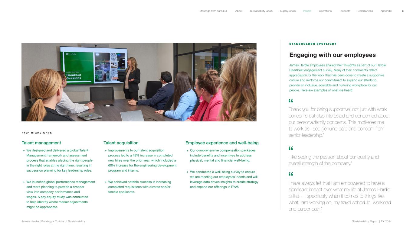 S TA K E H O L D E R S P O T L I G H T Engaging with our employees James Hardie employees shared their thoughts as part of our Hardie Heartbeat engagement survey. Many of their comments reflect appreciation for the work that has been done to create a supportive culture and reinforce our commitment to expand our efforts to provide an inclusive, equitable and nurturing workplace for our people. Here are examples of what we heard: F Y 2 4 H I G H L I G H T S Talent management + We designed and delivered a global Talent Management framework and assessment process that enables placing the right people in the right roles at the right time, resulting in succession planning for key leadership roles. + We launched global performance management and merit planning to provide a broader view into company performance and wages. A pay equity study was conducted to help identify where market adjustments might be appropriate. Talent acquisition + Improvements to our talent acquisition process led to a 48% increase in completed new hires over the prior year, which included a 60% increase for the engineering development program and interns. + We achieved notable success in increasing completed requisitions with diverse and/or female applicants. Employee experience and well-being + Our comprehensive compensation packages include benefits and incentives to address physical, mental and financial well-being. + We conducted a well-being survey to ensure we are meeting our employees’ needs and will leverage data driven insights to create strategy and expand our offerings in FY25. Thank you for being supportive, not just with work concerns but also interested and concerned about our personal/family concerns. This motivates me to work as I see genuine care and concern from senior leadership.” I like seeing the passion about our quality and overall strength of the company.” I have always felt that I am empowered to have a significant impact over what my life at James Hardie is like — specifically when it comes to things like what I am working on, my travel schedule, workload and career path.” 8 James Hardie | Building a Culture of Sustainability Sustainability Repor t | FY 2024 About Sustainability Goals Supply Chain OperationsMessage from our CEO People Products Communities Appendix