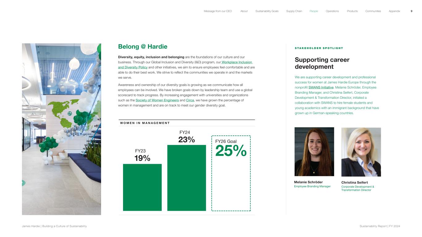 S TA K E H O L D E R S P O T L I G H T Supporting career development We are supporting career development and professional success for women at James Hardie Europe through the nonprofit SWANS Initiative. Melanie Schröder, Employee Branding Manager, and Christina Seifert, Corporate Development & Transformation Director, initiated a collaboration with SWANS to hire female students and young academics with an immigrant background that have grown up in German-speaking countries. Belong @ Hardie Diversity, equity, inclusion and belonging are the foundations of our culture and our business. Through our Global Inclusion and Diversity (I&D) program, our Workplace Inclusion and Diversity Policy and other initiatives, we aim to ensure employees feel comfortable and are able to do their best work. We strive to reflect the communities we operate in and the markets we serve. Awareness and ownership of our diversity goals is growing as we communicate how all employees can be involved. We have broken goals down by leadership team and use a global scorecard to track progress. By increasing engagement with universities and organizations such as the Society of Women Engineers and Circa, we have grown the percentage of women in management and are on track to meet our gender diversity goal. Christina Seifert Corporate Development & Transformation Director Melanie Schröder Employee Branding Manager W O M E N I N M A N A G E M E N T FY26 Goal 25%FY23 19% FY24 23% 9 James Hardie | Building a Culture of Sustainability Sustainability Repor t | FY 2024 About Sustainability Goals Supply Chain OperationsMessage from our CEO People Products Communities Appendix