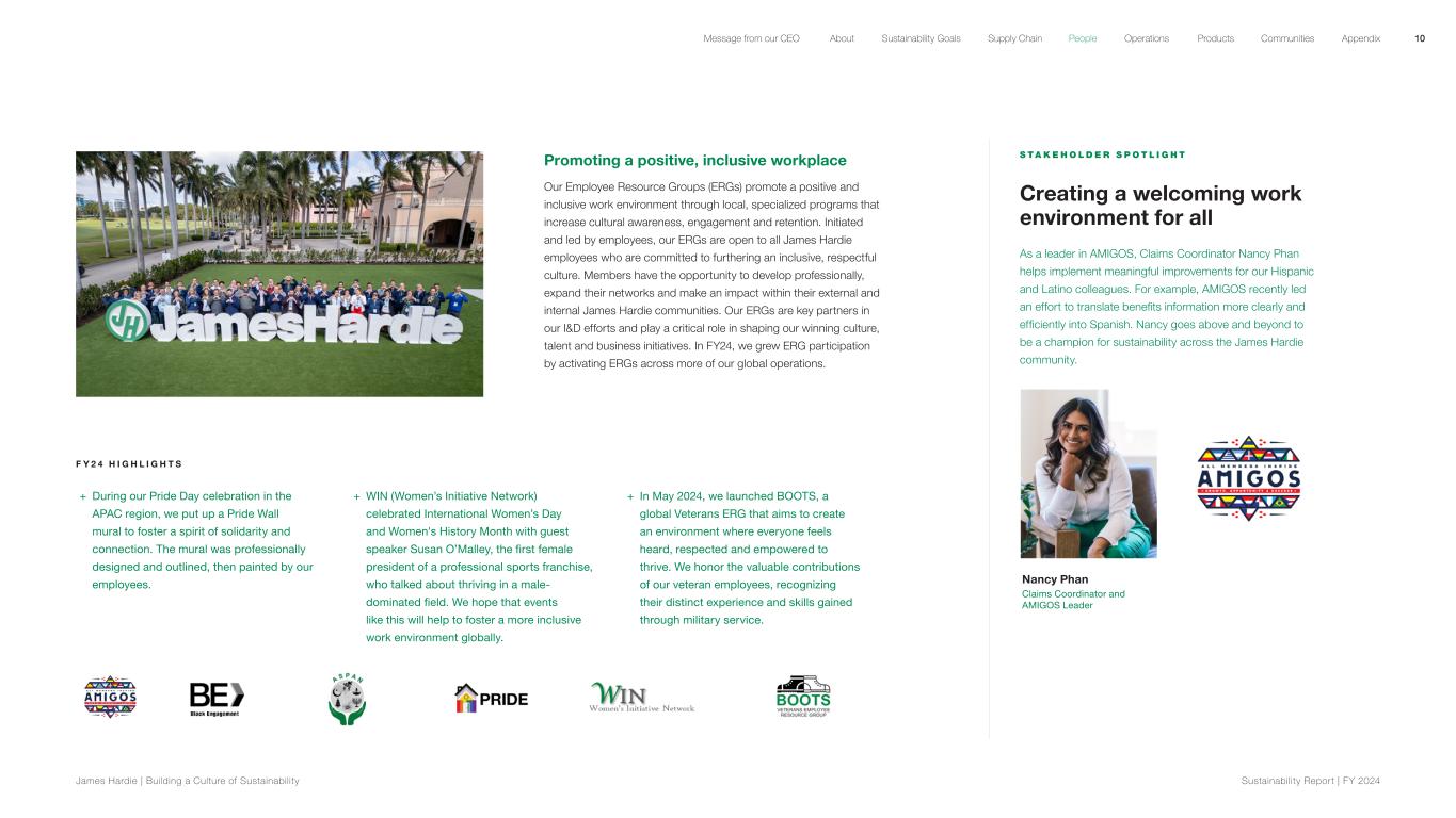 Promoting a positive, inclusive workplace Our Employee Resource Groups (ERGs) promote a positive and inclusive work environment through local, specialized programs that increase cultural awareness, engagement and retention. Initiated and led by employees, our ERGs are open to all James Hardie employees who are committed to furthering an inclusive, respectful culture. Members have the opportunity to develop professionally, expand their networks and make an impact within their external and internal James Hardie communities. Our ERGs are key partners in our I&D efforts and play a critical role in shaping our winning culture, talent and business initiatives. In FY24, we grew ERG participation by activating ERGs across more of our global operations. F Y 2 4 H I G H L I G H T S + During our Pride Day celebration in the APAC region, we put up a Pride Wall mural to foster a spirit of solidarity and connection. The mural was professionally designed and outlined, then painted by our employees. + WIN (Women’s Initiative Network) celebrated International Women’s Day and Women's History Month with guest speaker Susan O’Malley, the first female president of a professional sports franchise, who talked about thriving in a male- dominated field. We hope that events like this will help to foster a more inclusive work environment globally. + In May 2024, we launched BOOTS, a global Veterans ERG that aims to create an environment where everyone feels heard, respected and empowered to thrive. We honor the valuable contributions of our veteran employees, recognizing their distinct experience and skills gained through military service. S TA K E H O L D E R S P O T L I G H T Creating a welcoming work environment for all As a leader in AMIGOS, Claims Coordinator Nancy Phan helps implement meaningful improvements for our Hispanic and Latino colleagues. For example, AMIGOS recently led an effort to translate benefits information more clearly and efficiently into Spanish. Nancy goes above and beyond to be a champion for sustainability across the James Hardie community. Nancy Phan Claims Coordinator and AMIGOS Leader 10 James Hardie | Building a Culture of Sustainability Sustainability Repor t | FY 2024 About Sustainability Goals Supply Chain OperationsMessage from our CEO People Products Communities Appendix