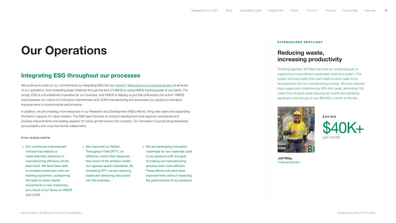 Our Operations Integrating ESG throughout our processes We continue to build on our commitments by integrating ESG into our Hardie™ Manufacturing Operating System at all levels of our operations, from evaluating large initiatives through the lens of HMOS to using HMOS tracking goals at our plants. Put simply, ESG is a foundational imperative for our business, and HMOS is helping us put that philosophy into action. HMOS encompasses our culture of continuous improvement and LEAN manufacturing and empowers our people to champion improvements to environmental performance. In addition, we are investing more resources in our Research and Development (R&D) efforts, hiring new talent and expanding the team’s capacity for value creation. The R&D team focuses on product development and supports operational and process improvements and adding capacity for future growth across the company. Our Innovation Councils bring leadership accountability and cross-functional collaboration. F Y 2 4 H I G H L I G H T S + Our continuous improvement mindset has helped us make dramatic advances in manufacturing efficiency at the plant level. We have been able to increase production with our existing equipment, postponing the need to make capital investments in new machinery, as a result of our focus on HMOS and LEAN. + We improved our Rolled Throughput Yield (RTY), an efficiency metric that measures how much of the product meets our rigorous quality standards. By increasing RTY, we are reducing waste and delivering value back into the business. + We are developing innovation roadmaps for raw materials used in our products with the goal of making our manufacturing process even more efficient. These efforts will yield value improvements without impacting the performance of our products. S TA K E H O L D E R S P O T L I G H T Reducing waste, increasing productivity Finishing Operator Jeff Riley has done an outstanding job of supporting a more efficient wastewater treatment system. This system removes solids from paint wash to allow water to be recycled back into our manufacturing process. We have reduced liquid waste paint collections by 93% from peak, eliminating 130 metric tons of liquid waste disposal per month and delivering significant cost savings of over $40,000 a month at this site. Jeff Riley Finishing Operator S A V I N G $40K+ per month 11 James Hardie | Building a Culture of Sustainability Sustainability Repor t | FY 2024 About Sustainability Goals Supply Chain OperationsMessage from our CEO People Products Communities Appendix