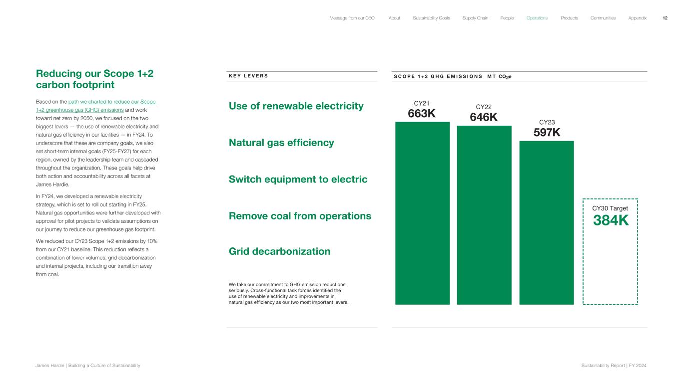 Reducing our Scope 1+2 carbon footprint Based on the path we charted to reduce our Scope 1+2 greenhouse gas (GHG) emissions and work toward net zero by 2050, we focused on the two biggest levers — the use of renewable electricity and natural gas efficiency in our facilities — in FY24. To underscore that these are company goals, we also set short-term internal goals (FY25-FY27) for each region, owned by the leadership team and cascaded throughout the organization. These goals help drive both action and accountability across all facets at James Hardie. In FY24, we developed a renewable electricity strategy, which is set to roll out starting in FY25. Natural gas opportunities were further developed with approval for pilot projects to validate assumptions on our journey to reduce our greenhouse gas footprint. We reduced our CY23 Scope 1+2 emissions by 10% from our CY21 baseline. This reduction reflects a combination of lower volumes, grid decarbonization and internal projects, including our transition away from coal. K E Y L E V E R S S C O P E 1 + 2 G H G E M I S S I O N S M T CO2e Use of renewable electricity Natural gas efficiency Switch equipment to electric Remove coal from operations Grid decarbonization We take our commitment to GHG emission reductions seriously. Cross-functional task forces identified the use of renewable electricity and improvements in natural gas efficiency as our two most important levers. CY21 663K CY22 646K CY23 597K CY30 Target 384K 12 James Hardie | Building a Culture of Sustainability Sustainability Repor t | FY 2024 About Sustainability Goals Supply Chain OperationsMessage from our CEO People Products Communities Appendix
