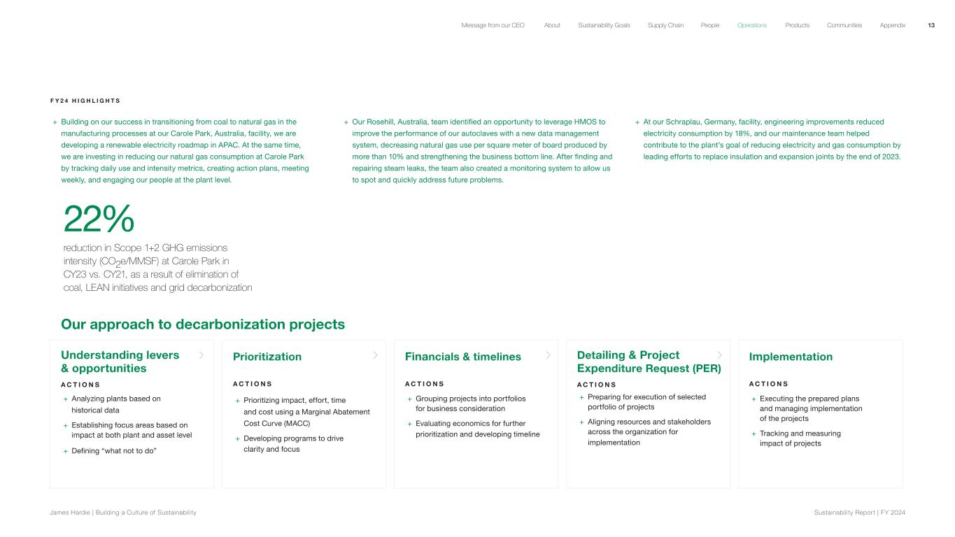 Our approach to decarbonization projects Understanding levers & opportunities A C T I O N S + Analyzing plants based on historical data + Establishing focus areas based on impact at both plant and asset level + Defining “what not to do” Prioritization A C T I O N S + Prioritizing impact, effort, time and cost using a Marginal Abatement Cost Curve (MACC) + Developing programs to drive clarity and focus Financials & timelines A C T I O N S + Grouping projects into portfolios for business consideration + Evaluating economics for further prioritization and developing timeline Detailing & Project Expenditure Request (PER) A C T I O N S + Preparing for execution of selected portfolio of projects + Aligning resources and stakeholders across the organization for implementation Implementation A C T I O N S + Executing the prepared plans and managing implementation of the projects + Tracking and measuring impact of projects F Y 2 4 H I G H L I G H T S + Building on our success in transitioning from coal to natural gas in the manufacturing processes at our Carole Park, Australia, facility, we are developing a renewable electricity roadmap in APAC. At the same time, we are investing in reducing our natural gas consumption at Carole Park by tracking daily use and intensity metrics, creating action plans, meeting weekly, and engaging our people at the plant level. 22% reduction in Scope 1+2 GHG emissions intensity (CO2e/MMSF) at Carole Park in CY23 vs. CY21, as a result of elimination of coal, LEAN initiatives and grid decarbonization + Our Rosehill, Australia, team identified an opportunity to leverage HMOS to improve the performance of our autoclaves with a new data management system, decreasing natural gas use per square meter of board produced by more than 10% and strengthening the business bottom line. After finding and repairing steam leaks, the team also created a monitoring system to allow us to spot and quickly address future problems. + At our Schraplau, Germany, facility, engineering improvements reduced electricity consumption by 18%, and our maintenance team helped contribute to the plant’s goal of reducing electricity and gas consumption by leading efforts to replace insulation and expansion joints by the end of 2023. 13 James Hardie | Building a Culture of Sustainability Sustainability Repor t | FY 2024 About Sustainability Goals Supply Chain OperationsMessage from our CEO People Products Communities Appendix