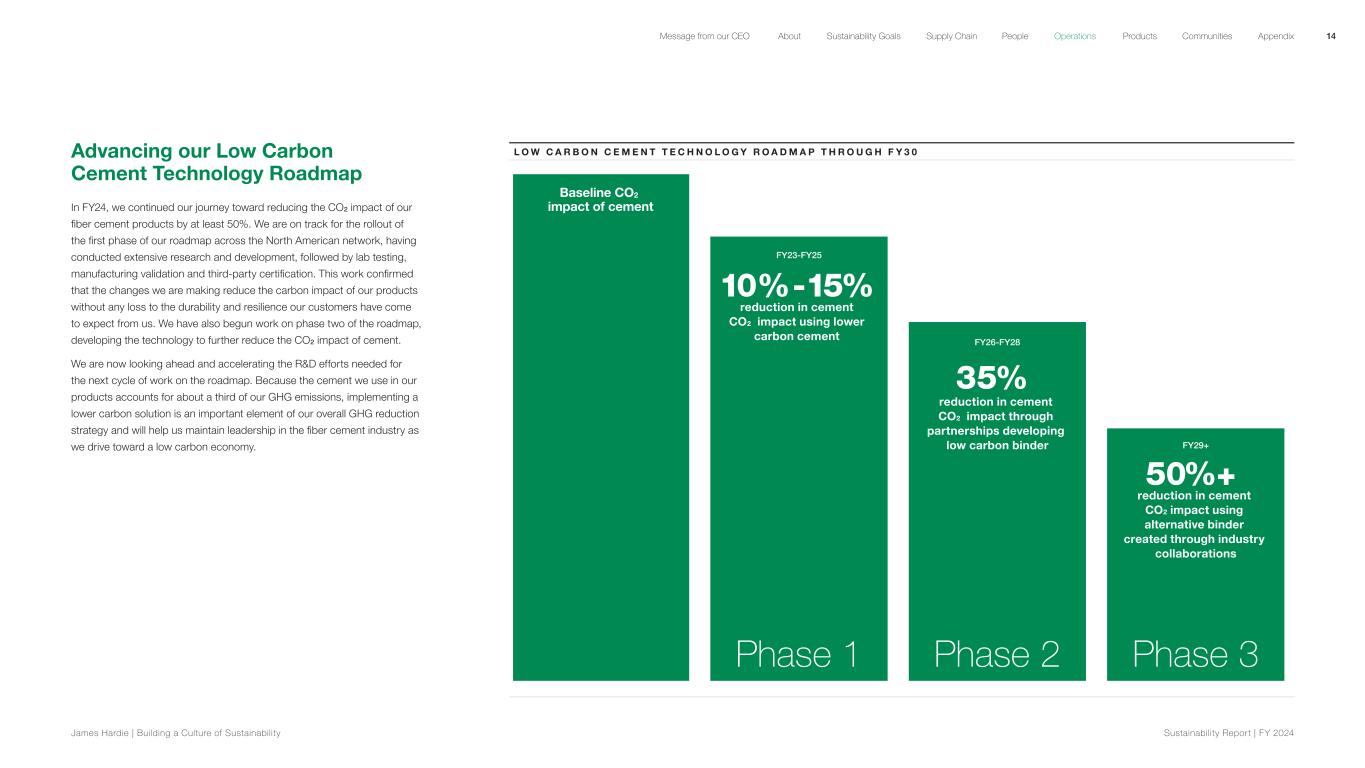 Advancing our Low Carbon Cement Technology Roadmap In FY24, we continued our journey toward reducing the CO² impact of our fiber cement products by at least 50%. We are on track for the rollout of the first phase of our roadmap across the North American network, having conducted extensive research and development, followed by lab testing, manufacturing validation and third-party certification. This work confirmed that the changes we are making reduce the carbon impact of our products without any loss to the durability and resilience our customers have come to expect from us. We have also begun work on phase two of the roadmap, developing the technology to further reduce the CO² impact of cement. We are now looking ahead and accelerating the R&D efforts needed for the next cycle of work on the roadmap. Because the cement we use in our products accounts for about a third of our GHG emissions, implementing a lower carbon solution is an important element of our overall GHG reduction strategy and will help us maintain leadership in the fiber cement industry as we drive toward a low carbon economy. L O W C A R B O N C E M E N T T E C H N O L O G Y R O A D M A P T H R O U G H F Y 3 0 Baseline CO2 impact of cement 10%-15% reduction in cement CO2 impact using lower carbon cement FY23-FY25 Phase 1 FY26-FY28 35% reduction in cement CO2 impact through partnerships developing low carbon binder Phase 2 FY29+ 50%+ reduction in cement CO2 impact using alternative binder created through industry collaborations Phase 3 14 James Hardie | Building a Culture of Sustainability Sustainability Repor t | FY 2024 About Sustainability Goals Supply Chain OperationsMessage from our CEO People Products Communities Appendix