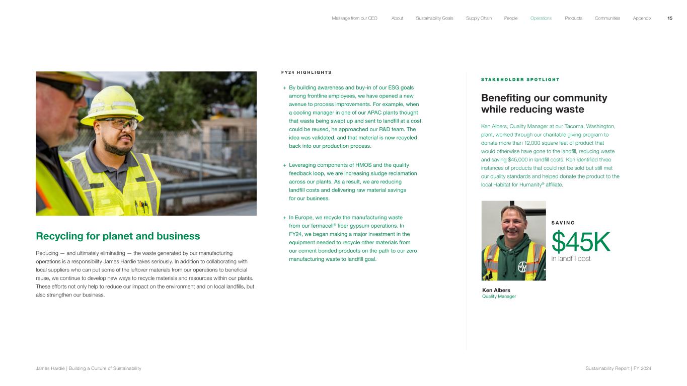 S TA K E H O L D E R S P O T L I G H T Benefiting our community while reducing waste Ken Albers, Quality Manager at our Tacoma, Washington, plant, worked through our charitable giving program to donate more than 12,000 square feet of product that would otherwise have gone to the landfill, reducing waste and saving $45,000 in landfill costs. Ken identified three instances of products that could not be sold but still met our quality standards and helped donate the product to the local Habitat for Humanity® affiliate. Recycling for planet and business Reducing — and ultimately eliminating — the waste generated by our manufacturing operations is a responsibility James Hardie takes seriously. In addition to collaborating with local suppliers who can put some of the leftover materials from our operations to beneficial reuse, we continue to develop new ways to recycle materials and resources within our plants. These efforts not only help to reduce our impact on the environment and on local landfills, but also strengthen our business. F Y 2 4 H I G H L I G H T S + By building awareness and buy-in of our ESG goals among frontline employees, we have opened a new avenue to process improvements. For example, when a cooling manager in one of our APAC plants thought that waste being swept up and sent to landfill at a cost could be reused, he approached our R&D team. The idea was validated, and that material is now recycled back into our production process. + Leveraging components of HMOS and the quality feedback loop, we are increasing sludge reclamation across our plants. As a result, we are reducing landfill costs and delivering raw material savings for our business. + In Europe, we recycle the manufacturing waste from our fermacell® fiber gypsum operations. In FY24, we began making a major investment in the equipment needed to recycle other materials from our cement bonded products on the path to our zero manufacturing waste to landfill goal. Ken Albers Quality Manager S A V I N G $45K in landfill cost 15 James Hardie | Building a Culture of Sustainability Sustainability Repor t | FY 2024 About Sustainability Goals Supply Chain OperationsMessage from our CEO People Products Communities Appendix