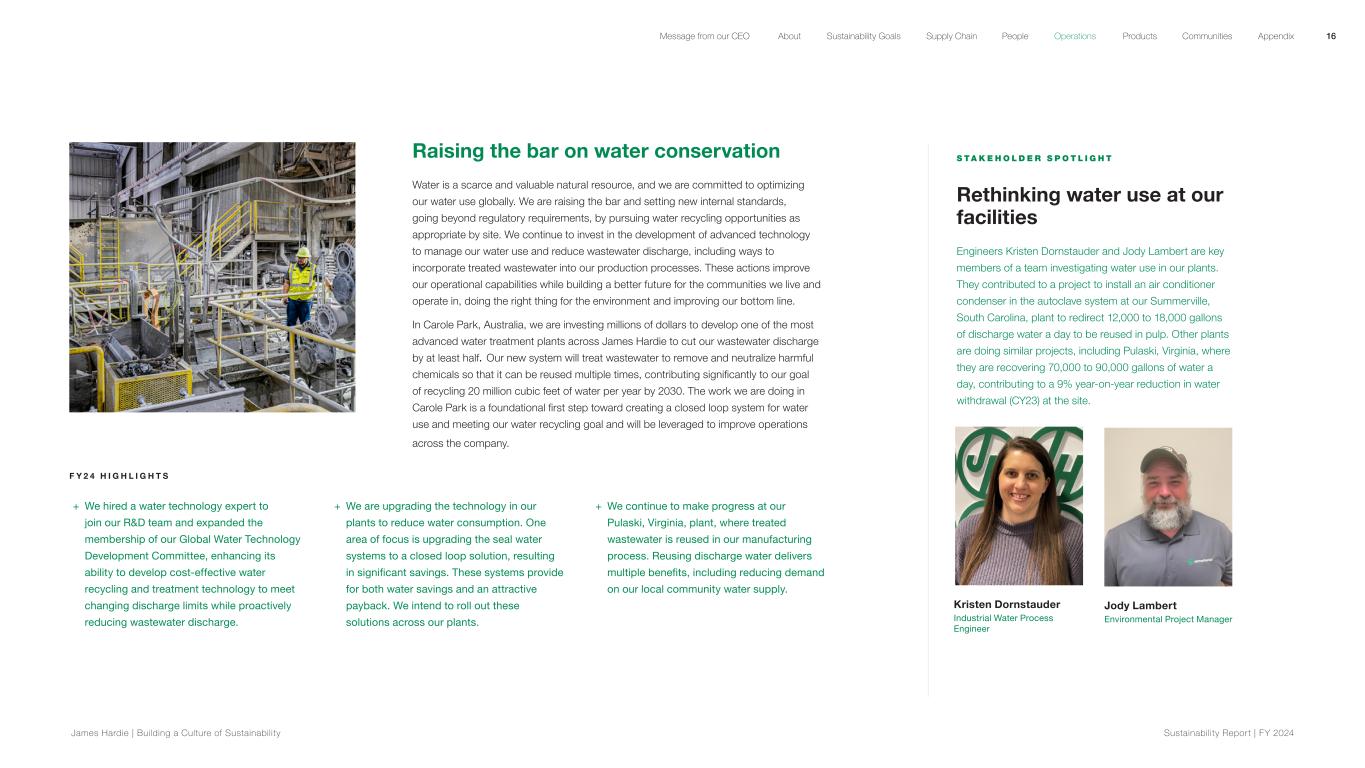S TA K E H O L D E R S P O T L I G H T Rethinking water use at our facilities Engineers Kristen Dornstauder and Jody Lambert are key members of a team investigating water use in our plants. They contributed to a project to install an air conditioner condenser in the autoclave system at our Summerville, South Carolina, plant to redirect 12,000 to 18,000 gallons of discharge water a day to be reused in pulp. Other plants are doing similar projects, including Pulaski, Virginia, where they are recovering 70,000 to 90,000 gallons of water a day, contributing to a 9% year-on-year reduction in water withdrawal (CY23) at the site. Raising the bar on water conservation Water is a scarce and valuable natural resource, and we are committed to optimizing our water use globally. We are raising the bar and setting new internal standards, going beyond regulatory requirements, by pursuing water recycling opportunities as appropriate by site. We continue to invest in the development of advanced technology to manage our water use and reduce wastewater discharge, including ways to incorporate treated wastewater into our production processes. These actions improve our operational capabilities while building a better future for the communities we live and operate in, doing the right thing for the environment and improving our bottom line. In Carole Park, Australia, we are investing millions of dollars to develop one of the most advanced water treatment plants across James Hardie to cut our wastewater discharge by at least half. Our new system will treat wastewater to remove and neutralize harmful chemicals so that it can be reused multiple times, contributing significantly to our goal of recycling 20 million cubic feet of water per year by 2030. The work we are doing in Carole Park is a foundational first step toward creating a closed loop system for water use and meeting our water recycling goal and will be leveraged to improve operations across the company. F Y 2 4 H I G H L I G H T S + We hired a water technology expert to join our R&D team and expanded the membership of our Global Water Technology Development Committee, enhancing its ability to develop cost-effective water recycling and treatment technology to meet changing discharge limits while proactively reducing wastewater discharge. + We are upgrading the technology in our plants to reduce water consumption. One area of focus is upgrading the seal water systems to a closed loop solution, resulting in significant savings. These systems provide for both water savings and an attractive payback. We intend to roll out these solutions across our plants. + We continue to make progress at our Pulaski, Virginia, plant, where treated wastewater is reused in our manufacturing process. Reusing discharge water delivers multiple benefits, including reducing demand on our local community water supply. Jody Lambert Environmental Project Manager Kristen Dornstauder Industrial Water Process Engineer 16 James Hardie | Building a Culture of Sustainability Sustainability Repor t | FY 2024 About Sustainability Goals Supply Chain OperationsMessage from our CEO People Products Communities Appendix