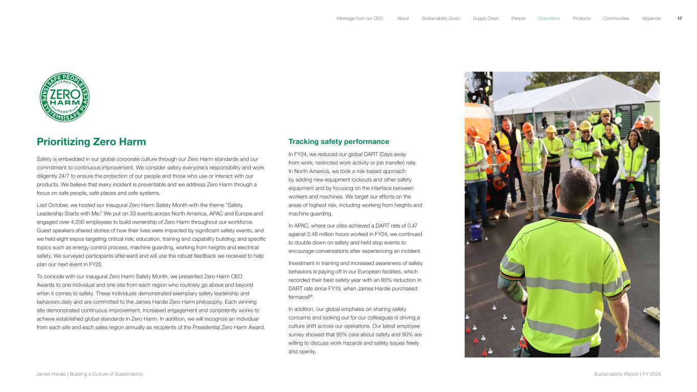 Tracking safety performance In FY24, we reduced our global DART (Days away from work, restricted work activity or job transfer) rate. In North America, we took a risk-based approach by adding new equipment lockouts and other safety equipment and by focusing on the interface between workers and machines. We target our efforts on the areas of highest risk, including working from heights and machine guarding. In APAC, where our sites achieved a DART rate of 0.47 against 2.48 million hours worked in FY24, we continued to double down on safety and held stop events to encourage conversations after experiencing an incident. Investment in training and increased awareness of safety behaviors is paying off in our European facilities, which recorded their best safety year with an 80% reduction in DART rate since FY19, when James Hardie purchased fermacell®. In addition, our global emphasis on sharing safety concerns and looking out for our colleagues is driving a culture shift across our operations. Our latest employee survey showed that 95% care about safety and 90% are willing to discuss work hazards and safety issues freely and openly. Prioritizing Zero Harm Safety is embedded in our global corporate culture through our Zero Harm standards and our commitment to continuous improvement. We consider safety everyone’s responsibility and work diligently 24/7 to ensure the protection of our people and those who use or interact with our products. We believe that every incident is preventable and we address Zero Harm through a focus on safe people, safe places and safe systems. Last October, we hosted our inaugural Zero Harm Safety Month with the theme “Safety Leadership Starts with Me.” We put on 33 events across North America, APAC and Europe and engaged over 4,200 employees to build ownership of Zero Harm throughout our workforce. Guest speakers shared stories of how their lives were impacted by significant safety events, and we held eight expos targeting critical risk; education, training and capability building; and specific topics such as energy control process, machine guarding, working from heights and electrical safety. We surveyed participants afterward and will use the robust feedback we received to help plan our next event in FY25. To coincide with our inaugural Zero Harm Safety Month, we presented Zero Harm CEO Awards to one individual and one site from each region who routinely go above and beyond when it comes to safety. These individuals demonstrated exemplary safety leadership and behaviors daily and are committed to the James Hardie Zero Harm philosophy. Each winning site demonstrated continuous improvement, increased engagement and consistently works to achieve established global standards in Zero Harm. In addition, we will recognize an individual from each site and each sales region annually as recipients of the Presidential Zero Harm Award. 17 James Hardie | Building a Culture of Sustainability Sustainability Repor t | FY 2024 About Sustainability Goals Supply Chain OperationsMessage from our CEO People Products Communities Appendix