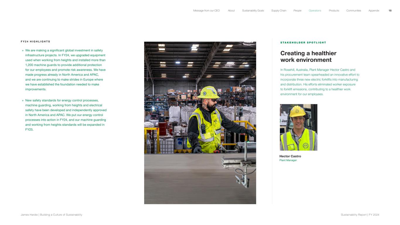 F Y 2 4 H I G H L I G H T S + We are making a significant global investment in safety infrastructure projects. In FY24, we upgraded equipment used when working from heights and installed more than 1,200 machine guards to provide additional protection for our employees and promote risk awareness. We have made progress already in North America and APAC, and we are continuing to make strides in Europe where we have established the foundation needed to make improvements. + New safety standards for energy control processes, machine guarding, working from heights and electrical safety have been developed and independently approved in North America and APAC. We put our energy control processes into action in FY24, and our machine guarding and working from heights standards will be expanded in FY25. S TA K E H O L D E R S P O T L I G H T Creating a healthier work environment In Rosehill, Australia, Plant Manager Hector Castro and his procurement team spearheaded an innovative effort to incorporate three new electric forklifts into manufacturing and distribution. His efforts eliminated worker exposure to forklift emissions, contributing to a healthier work environment for our employees. Hector Castro Plant Manager 18 James Hardie | Building a Culture of Sustainability Sustainability Repor t | FY 2024 About Sustainability Goals Supply Chain OperationsMessage from our CEO People Products Communities Appendix