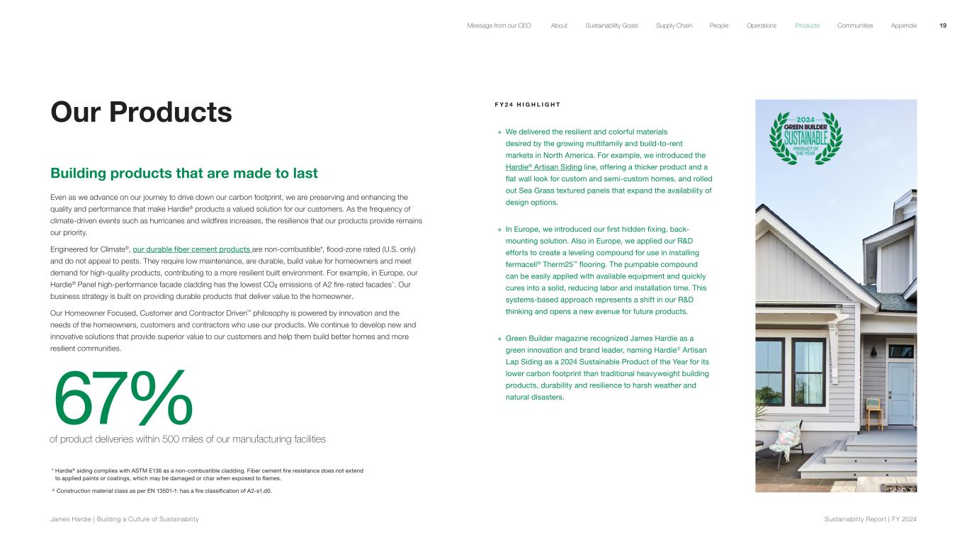 Our Products Building products that are made to last Even as we advance on our journey to drive down our carbon footprint, we are preserving and enhancing the quality and performance that make Hardie® products a valued solution for our customers. As the frequency of climate-driven events such as hurricanes and wildfires increases, the resilience that our products provide remains our priority. Engineered for Climate®, our durable fiber cement products are non-combustible*, flood-zone rated (U.S. only) and do not appeal to pests. They require low maintenance, are durable, build value for homeowners and meet demand for high-quality products, contributing to a more resilient built environment. For example, in Europe, our Hardie® Panel high-performance facade cladding has the lowest CO² emissions of A2 fire-rated facades^. Our business strategy is built on providing durable products that deliver value to the homeowner. Our Homeowner Focused, Customer and Contractor Driven™ philosophy is powered by innovation and the needs of the homeowners, customers and contractors who use our products. We continue to develop new and innovative solutions that provide superior value to our customers and help them build better homes and more resilient communities. F Y 2 4 H I G H L I G H T + We delivered the resilient and colorful materials desired by the growing multifamily and build-to-rent markets in North America. For example, we introduced the Hardie® Artisan Siding line, offering a thicker product and a flat wall look for custom and semi-custom homes, and rolled out Sea Grass textured panels that expand the availability of design options. + In Europe, we introduced our first hidden fixing, back- mounting solution. Also in Europe, we applied our R&D efforts to create a leveling compound for use in installing fermacell® Therm25™ flooring. The pumpable compound can be easily applied with available equipment and quickly cures into a solid, reducing labor and installation time. This systems-based approach represents a shift in our R&D thinking and opens a new avenue for future products. + Green Builder magazine recognized James Hardie as a green innovation and brand leader, naming Hardie® Artisan Lap Siding as a 2024 Sustainable Product of the Year for its lower carbon footprint than traditional heavyweight building products, durability and resilience to harsh weather and natural disasters. * Hardie® siding complies with ASTM E136 as a non-combustible cladding. Fiber cement fire resistance does not extend to applied paints or coatings, which may be damaged or char when exposed to flames. ^ Construction material class as per EN 13501-1: has a fire classification of A2-s1,d0. 67% of product deliveries within 500 miles of our manufacturing facilities 19 James Hardie | Building a Culture of Sustainability Sustainability Repor t | FY 2024 About Sustainability Goals Supply Chain OperationsMessage from our CEO People Products Communities Appendix