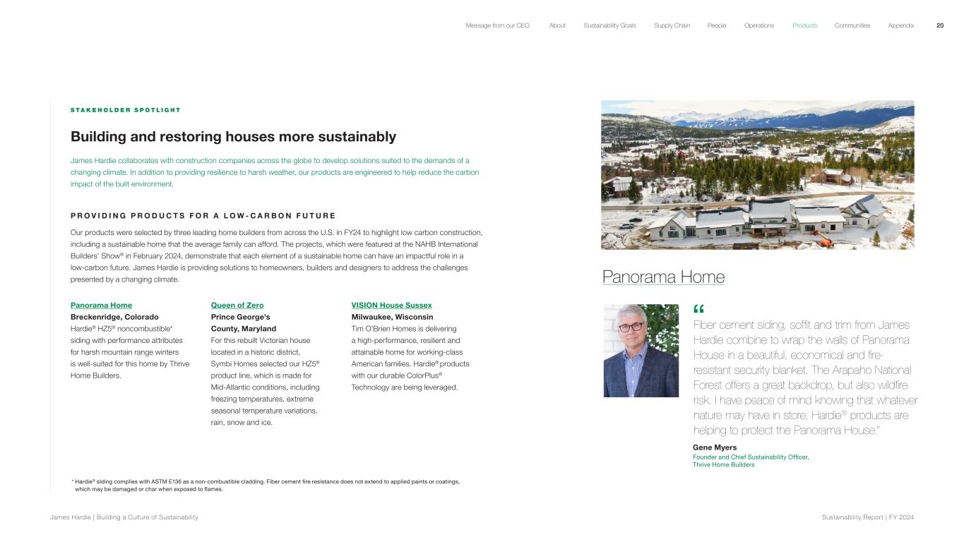 S TA K E H O L D E R S P O T L I G H T Building and restoring houses more sustainably James Hardie collaborates with construction companies across the globe to develop solutions suited to the demands of a changing climate. In addition to providing resilience to harsh weather, our products are engineered to help reduce the carbon impact of the built environment. P R O V I D I N G P R O D U C T S F O R A L O W - C A R B O N F U T U R E Our products were selected by three leading home builders from across the U.S. in FY24 to highlight low carbon construction, including a sustainable home that the average family can afford. The projects, which were featured at the NAHB International Builders’ Show® in February 2024, demonstrate that each element of a sustainable home can have an impactful role in a low-carbon future. James Hardie is providing solutions to homeowners, builders and designers to address the challenges presented by a changing climate. Panorama Home Breckenridge, Colorado Hardie® HZ5® noncombustible* siding with performance attributes for harsh mountain range winters is well-suited for this home by Thrive Home Builders. Queen of Zero Prince George's County, Maryland For this rebuilt Victorian house located in a historic district, Symbi Homes selected our HZ5® product line, which is made for Mid-Atlantic conditions, including freezing temperatures, extreme seasonal temperature variations, rain, snow and ice. VISION House Sussex Milwaukee, Wisconsin Tim O’Brien Homes is delivering a high-performance, resilient and attainable home for working-class American families. Hardie® products with our durable ColorPlus® Technology are being leveraged. * Hardie® sIding complies with ASTM E136 as a non-combustible cladding. Fiber cement fire resistance does not extend to applied paints or coatings, which may be damaged or char when exposed to flames. Panorama Home Fiber cement siding, soffit and trim from James Hardie combine to wrap the walls of Panorama House in a beautiful, economical and fire- resistant security blanket. The Arapaho National Forest offers a great backdrop, but also wildfire risk. I have peace of mind knowing that whatever nature may have in store, Hardie® products are helping to protect the Panorama House.” Gene Myers Founder and Chief Sustainability Officer, Thrive Home Builders 20 James Hardie | Building a Culture of Sustainability Sustainability Repor t | FY 2024 About Sustainability Goals Supply Chain OperationsMessage from our CEO People Products Communities Appendix