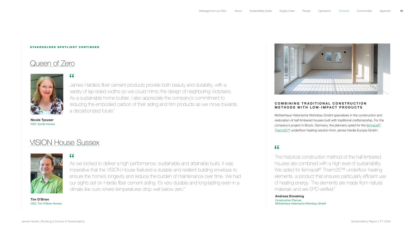 C O M B I N I N G T R A D I T I O N A L C O N S T R U C T I O N M E T H O D S W I T H L O W - I M P A C T P R O D U C T S Mühlenhaus Historische Wohnbau GmbH specializes in the construction and restoration of half-timbered houses built with traditional craftsmanship. For the company’s project in Brock, Germany, the planners opted for the fermacell® Therm25™ underfloor heating solution from James Hardie Europe GmbH. S TA K E H O L D E R S P O T L I G H T C O N T I N U E D The historical construction method of the half-timbered houses are combined with a high level of sustainability. We opted for fermacell® Therm25™ underfloor heating elements, a product that ensures particularly efficient use of heating energy. The elements are made from natural materials and are EPD-verified.” Queen of Zero James Hardie’s fiber cement products provide both beauty and durability, with a variety of lap-sided widths so we could mimic the design of neighboring Victorians. As a sustainable home builder, I also appreciate the company's commitment to reducing the embodied carbon of their siding and trim products as we move towards a decarbonized future.” Nicole Tysvaer CEO, Symbi Homes Andreas Enneking Construction Planner, Mühlenhaus Historische Wohnbau GmbH Tim O’Brien CEO, Tim O’Brien Homes As we looked to deliver a high performance, sustainable and attainable build, it was imperative that the VISION House featured a durable and resilient building envelope to ensure the home’s longevity and reduce the burden of maintenance over time. We had our sights set on Hardie fiber cement siding. It’s very durable and long-lasting even in a climate like ours where temperatures drop well below zero.” VISION House Sussex 21 James Hardie | Building a Culture of Sustainability Sustainability Repor t | FY 2024 About Sustainability Goals Supply Chain OperationsMessage from our CEO People Products Communities Appendix