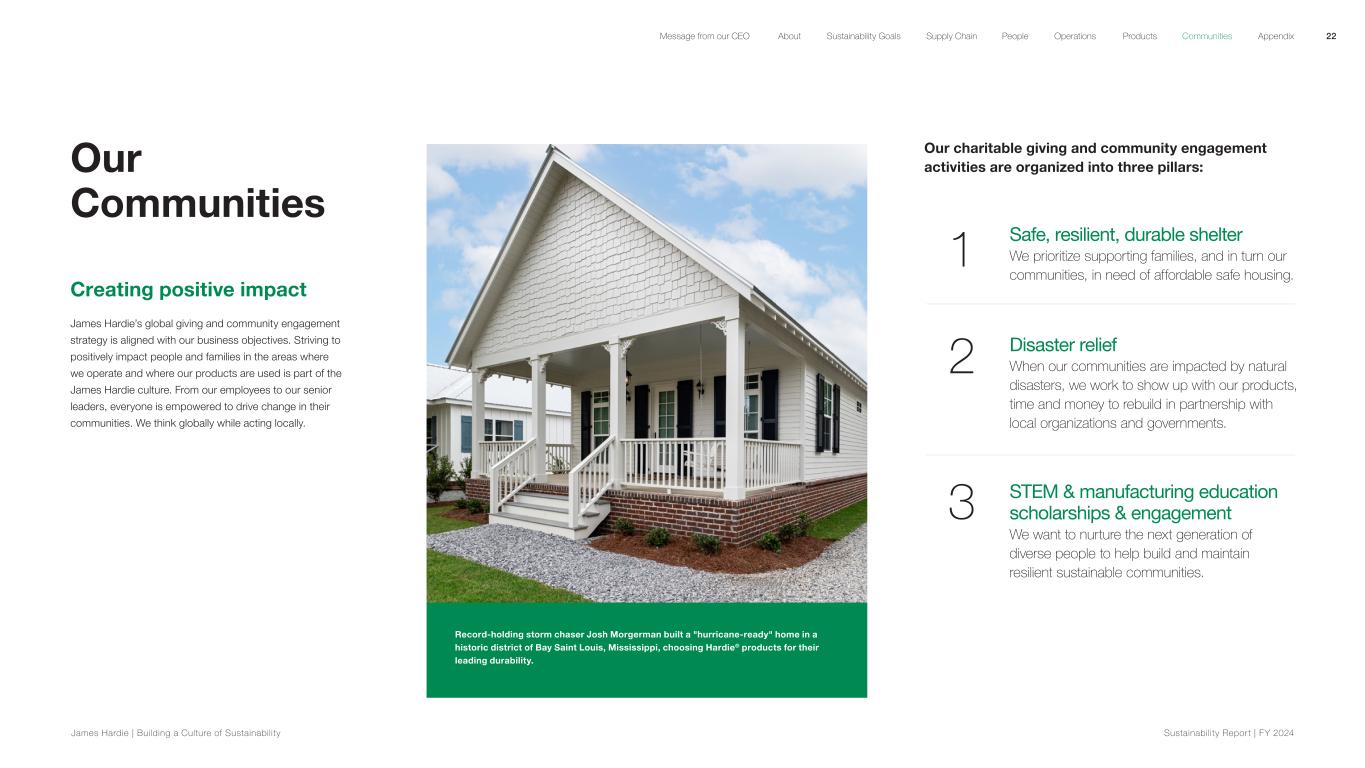 Our Communities Creating positive impact James Hardie’s global giving and community engagement strategy is aligned with our business objectives. Striving to positively impact people and families in the areas where we operate and where our products are used is part of the James Hardie culture. From our employees to our senior leaders, everyone is empowered to drive change in their communities. We think globally while acting locally. Our charitable giving and community engagement activities are organized into three pillars: Safe, resilient, durable shelter We prioritize supporting families, and in turn our communities, in need of affordable safe housing. Disaster relief When our communities are impacted by natural disasters, we work to show up with our products, time and money to rebuild in partnership with local organizations and governments. 1 2 3 STEM & manufacturing education scholarships & engagement We want to nurture the next generation of diverse people to help build and maintain resilient sustainable communities. Record-holding storm chaser Josh Morgerman built a "hurricane-ready" home in a historic district of Bay Saint Louis, Mississippi, choosing Hardie® products for their leading durability. 22 James Hardie | Building a Culture of Sustainability Sustainability Repor t | FY 2024 About Sustainability Goals Supply Chain OperationsMessage from our CEO People Products Communities Appendix