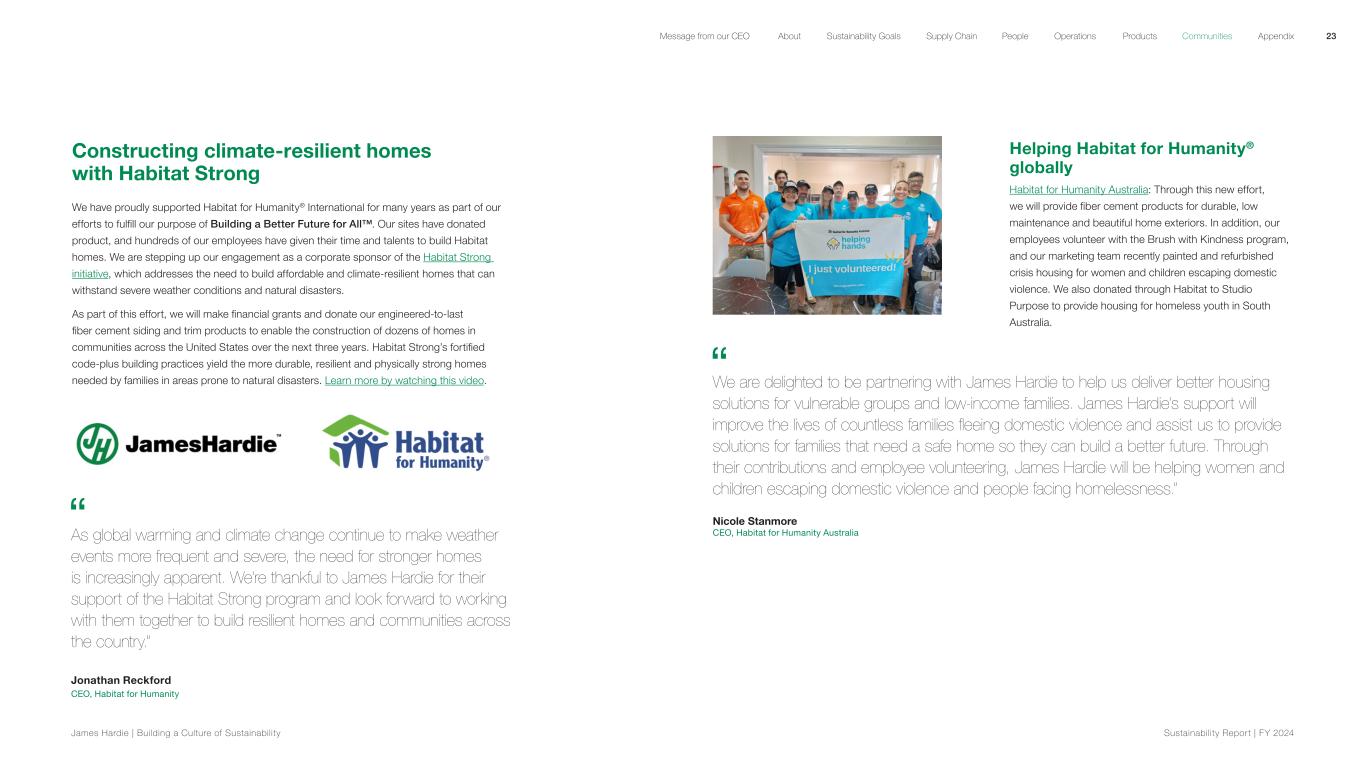 As global warming and climate change continue to make weather events more frequent and severe, the need for stronger homes is increasingly apparent. We’re thankful to James Hardie for their support of the Habitat Strong program and look forward to working with them together to build resilient homes and communities across the country.” Jonathan Reckford CEO, Habitat for Humanity Helping Habitat for Humanity® globally Habitat for Humanity Australia: Through this new effort, we will provide fiber cement products for durable, low maintenance and beautiful home exteriors. In addition, our employees volunteer with the Brush with Kindness program, and our marketing team recently painted and refurbished crisis housing for women and children escaping domestic violence. We also donated through Habitat to Studio Purpose to provide housing for homeless youth in South Australia. We are delighted to be partnering with James Hardie to help us deliver better housing solutions for vulnerable groups and low-income families. James Hardie’s support will improve the lives of countless families fleeing domestic violence and assist us to provide solutions for families that need a safe home so they can build a better future. Through their contributions and employee volunteering, James Hardie will be helping women and children escaping domestic violence and people facing homelessness.” Nicole Stanmore CEO, Habitat for Humanity Australia Constructing climate-resilient homes with Habitat Strong We have proudly supported Habitat for Humanity® International for many years as part of our efforts to fulfill our purpose of Building a Better Future for All™. Our sites have donated product, and hundreds of our employees have given their time and talents to build Habitat homes. We are stepping up our engagement as a corporate sponsor of the Habitat Strong initiative, which addresses the need to build affordable and climate-resilient homes that can withstand severe weather conditions and natural disasters. As part of this effort, we will make financial grants and donate our engineered-to-last fiber cement siding and trim products to enable the construction of dozens of homes in communities across the United States over the next three years. Habitat Strong’s fortified code-plus building practices yield the more durable, resilient and physically strong homes needed by families in areas prone to natural disasters. Learn more by watching this video. 23 James Hardie | Building a Culture of Sustainability Sustainability Repor t | FY 2024 About Sustainability Goals Supply Chain OperationsMessage from our CEO People Products Communities Appendix