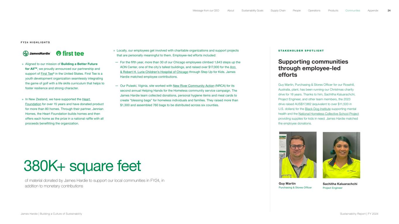 F Y 2 4 H I G H L I G H T S + Aligned to our mission of Building a Better Future for AllTM, we proudly announced our partnership and support of First Tee® in the United States. First Tee is a youth development organization seamlessly integrating the game of golf with a life skills curriculum that helps to foster resilience and strong character. + In New Zealand, we have supported the Heart Foundation for over 15 years and have donated product for more than 80 homes. Through their partner, Jennian Homes, the Heart Foundation builds homes and then offers each home as the prize in a national raffle with all proceeds benefitting the organization. + Locally, our employees get involved with charitable organizations and support projects that are personally meaningful to them. Employee-led efforts included: — For the fifth year, more than 30 of our Chicago employees climbed 1,643 steps up the AON Center, one of the city’s tallest buildings, and raised over $17,000 for the Ann & Robert H. Lurie Children’s Hospital of Chicago through Step Up for Kids. James Hardie matched employee contributions. — Our Pulaski, Viginia, site worked with New River Community Action (NRCA) for its second annual Helping Hands for the Homeless community service campaign. The James Hardie team collected donations, personal hygiene items and meal cards to create “blessing bags” for homeless individuals and families. They raised more than $1,300 and assembled 760 bags to be distributed across six counties. 380K+ square feet S TA K E H O L D E R S P O T L I G H T Supporting communities through employee-led efforts Guy Martin, Purchasing & Stores Officer for our Rosehill, Australia, plant, has been running our Christmas charity drive for 18 years. Thanks to him, Sachitha Kaluarachchi, Project Engineer, and other team members, the 2023 drive raised AUS$17,862 (equivalent to over $11,500 in U.S. dollars) for the Black Dog Institute supporting mental health and the National Homeless Collective School Project providing supplies for kids in need. James Hardie matched the employee donations. of material donated by James Hardie to support our local communities in FY24, in addition to monetary contributions Sachitha Kaluarachchi Project Engineer Guy Martin Purchasing & Stores Officer 24 James Hardie | Building a Culture of Sustainability Sustainability Repor t | FY 2024 About Sustainability Goals Supply Chain OperationsMessage from our CEO People Products Communities Appendix